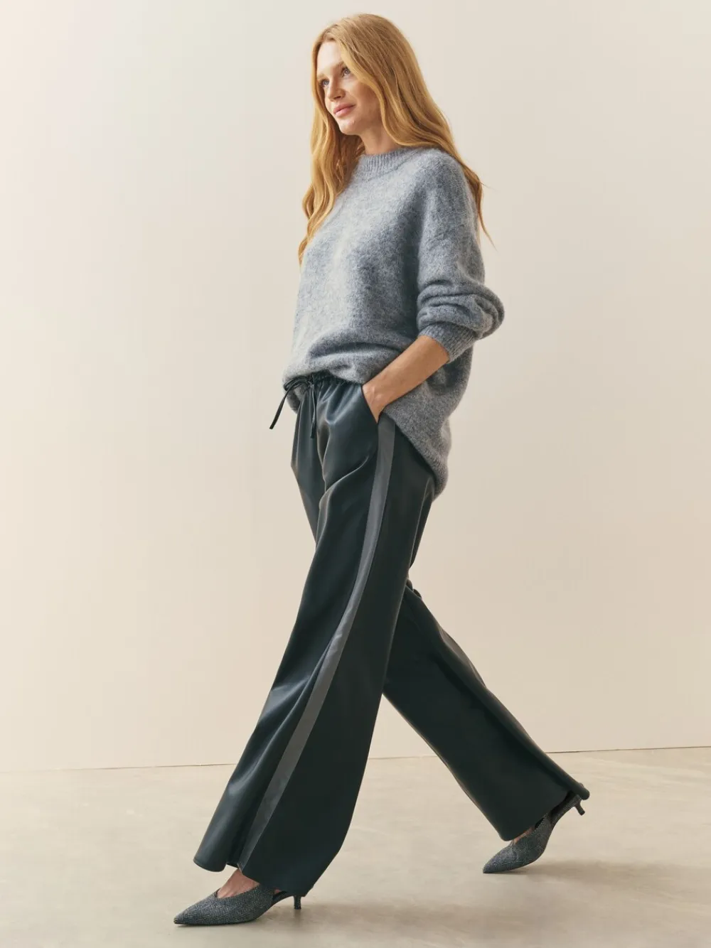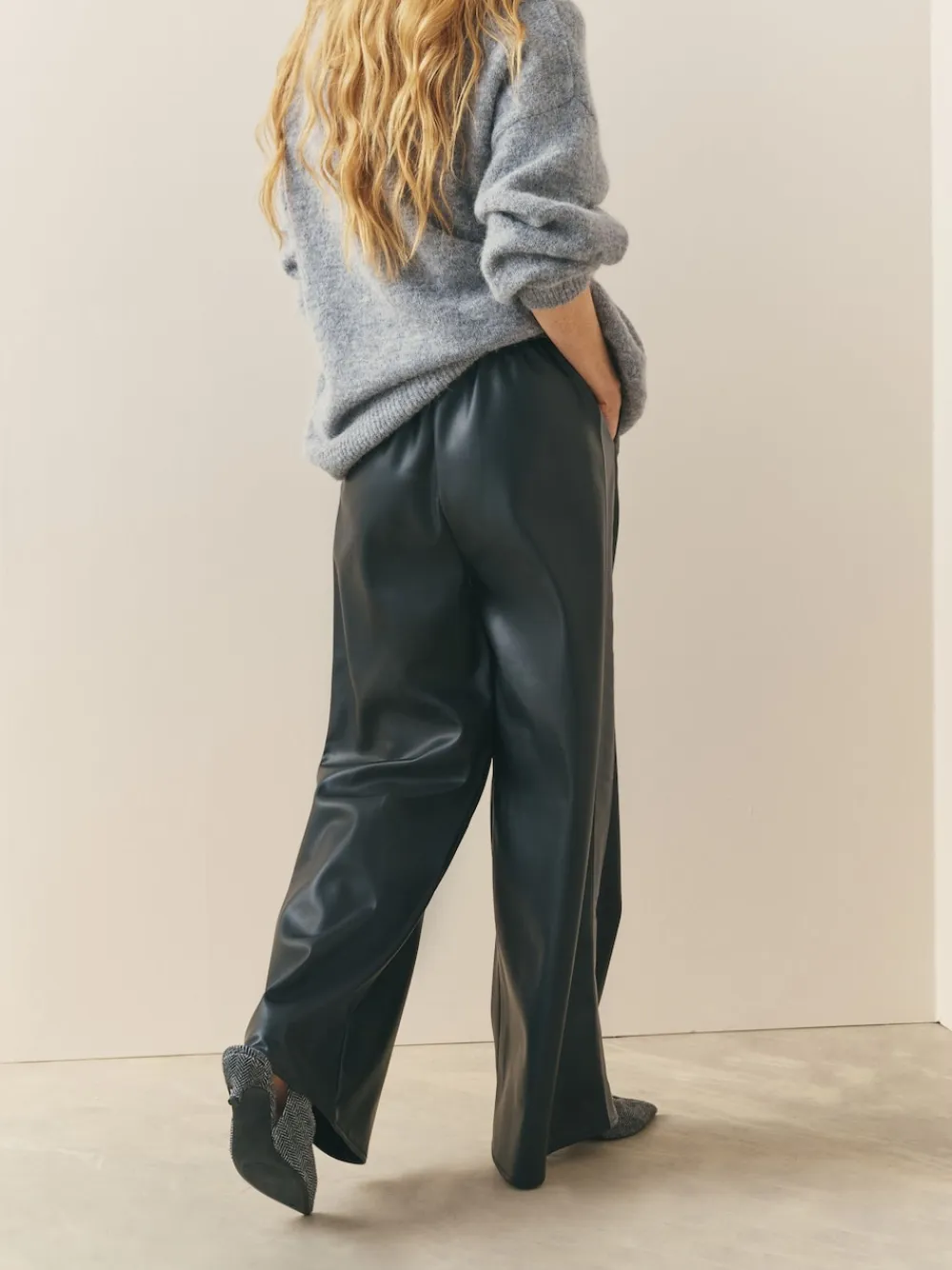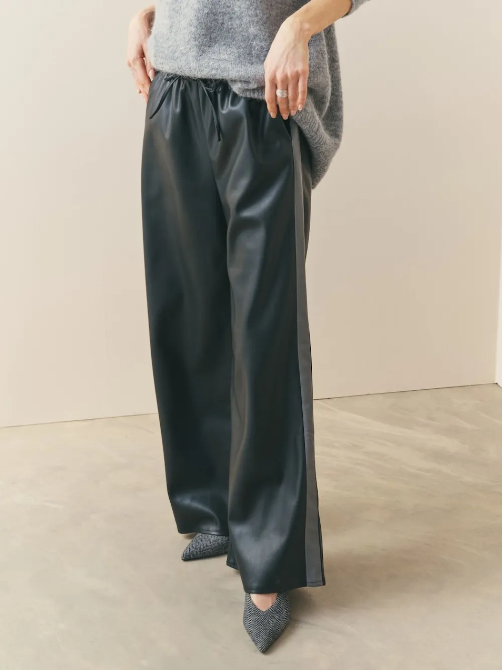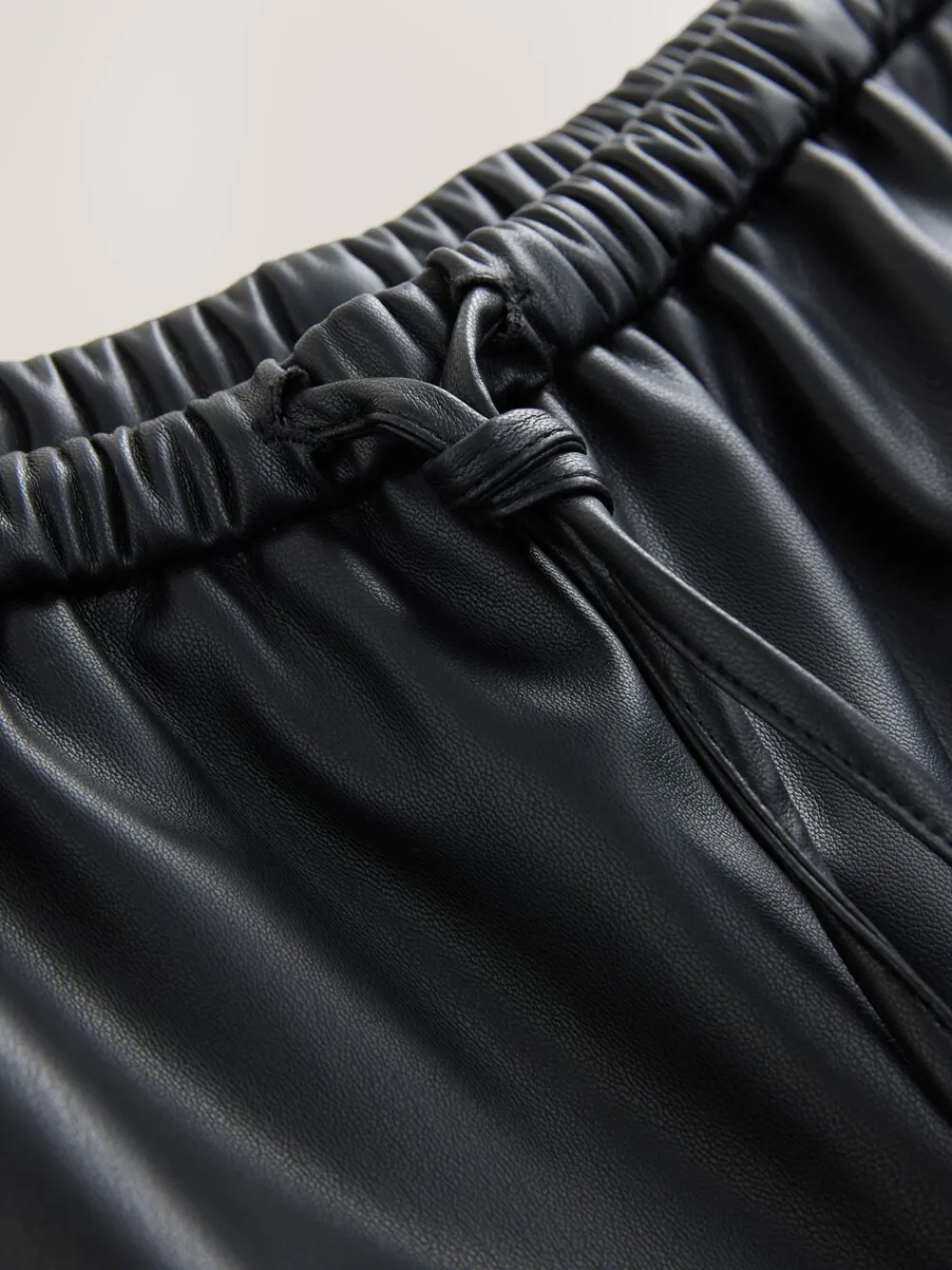 Reimagine your wardrobe with the Nothing Ordinary Black Faux Leather Side Stripe Trousers. These trousers redefine casual luxury, perfectly blending laid-back comfort with sophisticated style.Crafted from supple faux leather, they feature a relaxed wide leg silhouette that drapes beautifully. The contrast side stripe adds a sporty-chic detail, while the comfortable elasticated waist with tie detail ensures a perfect fit. These versatile trousers are designed to be a day-to-night staple. Pair them with a slouchy jumper by day for an effortless look, then switch to a fitted top and heels by night for a confident evening statement. Faux leather Wide leg Day to night style 100% Polyester with PU coating.