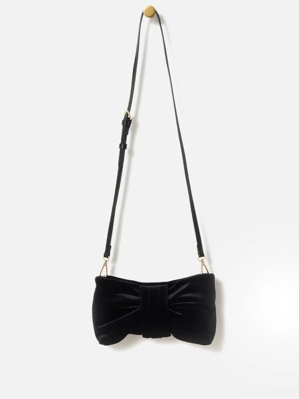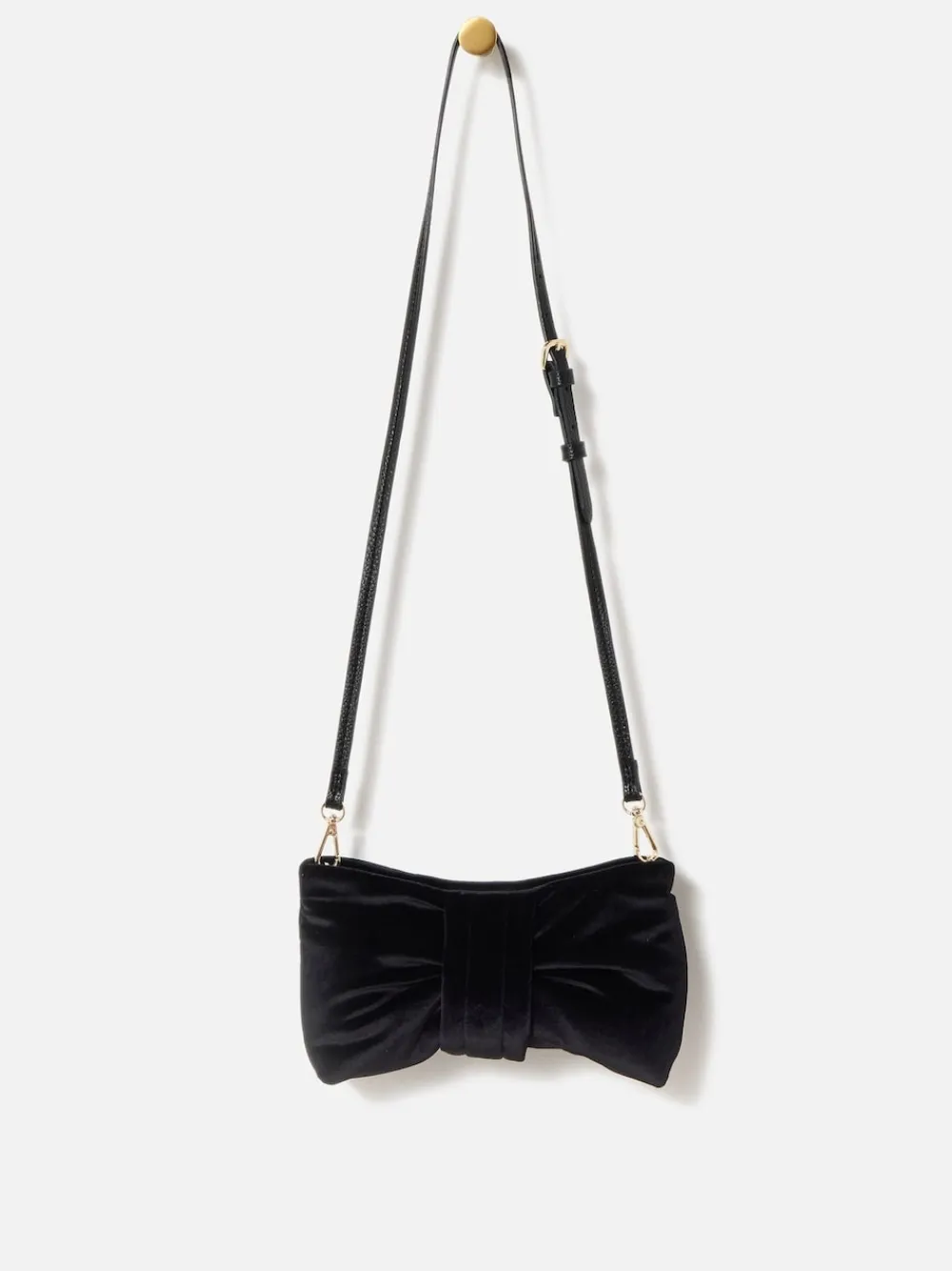 Made from soft black velvet, our clutch bag is the perfect accessory to complement your Christmas party outfits. Designed in a playful bow shape with a gold-toned zip closure, the interior features a black fabric lining and slip pocket to keep your small essentials separate. Complete with a slim, adjustable crossbody strap which can be removed to carry as a clutch for alternative styling solutions (a girl needs options). Height 14cm Width 24cm Depth 4.5cm Main 92% Polyester, 8% Elastane. Lining 100% Polyester.