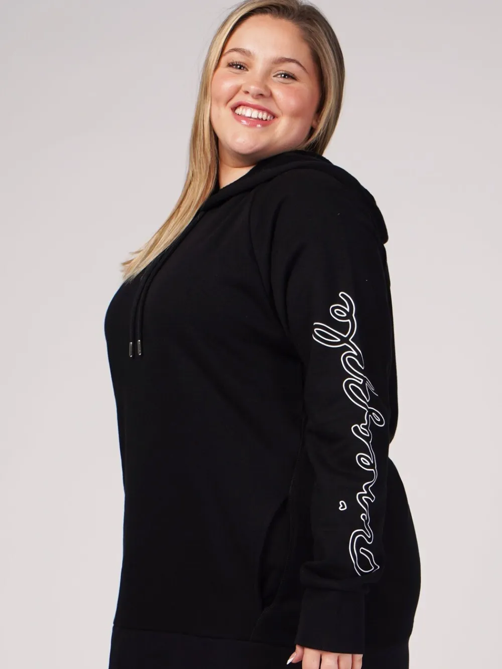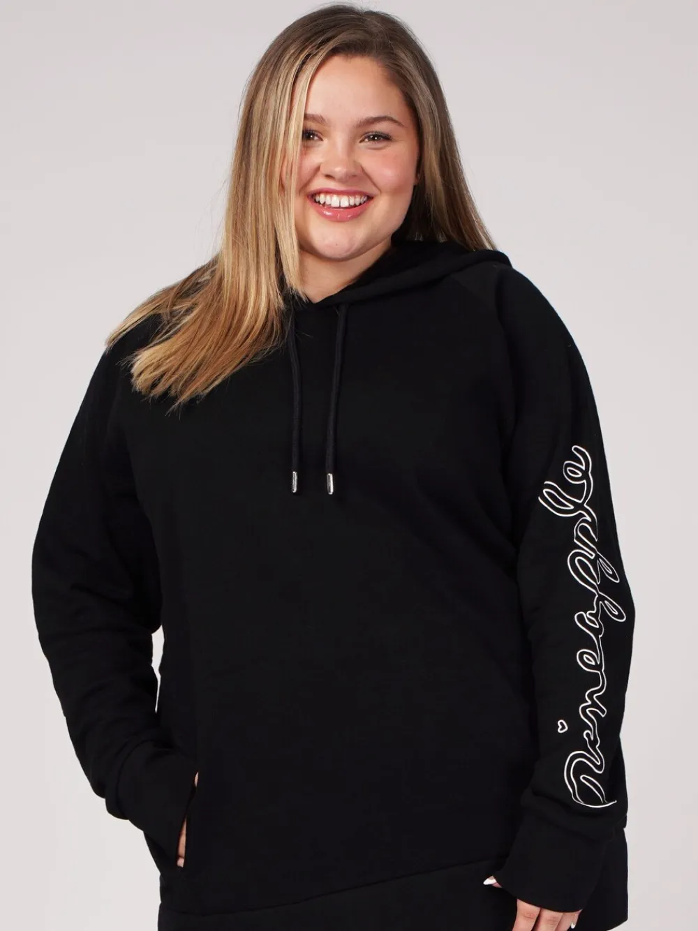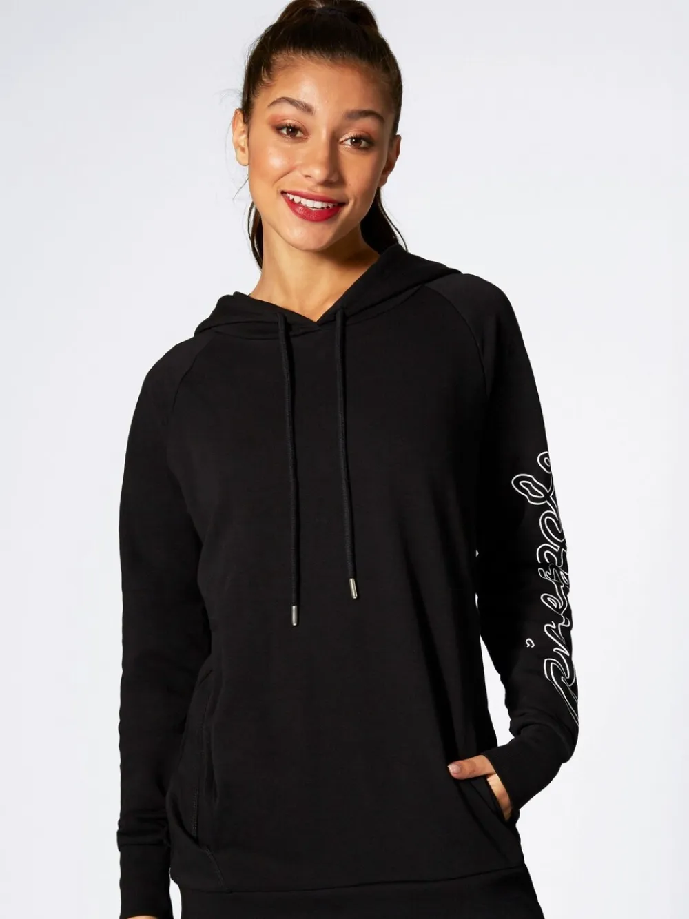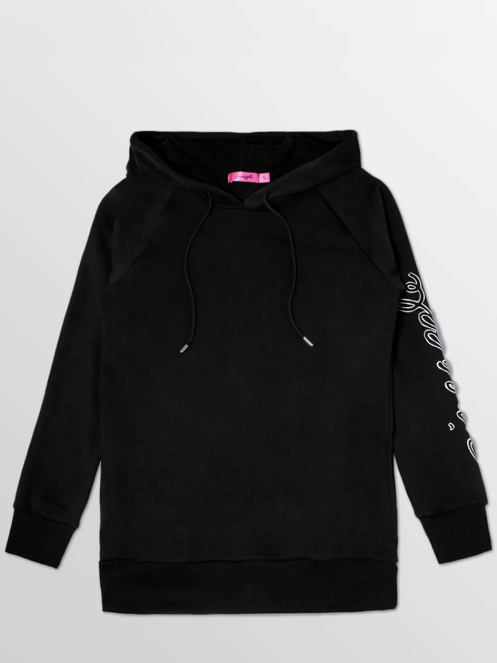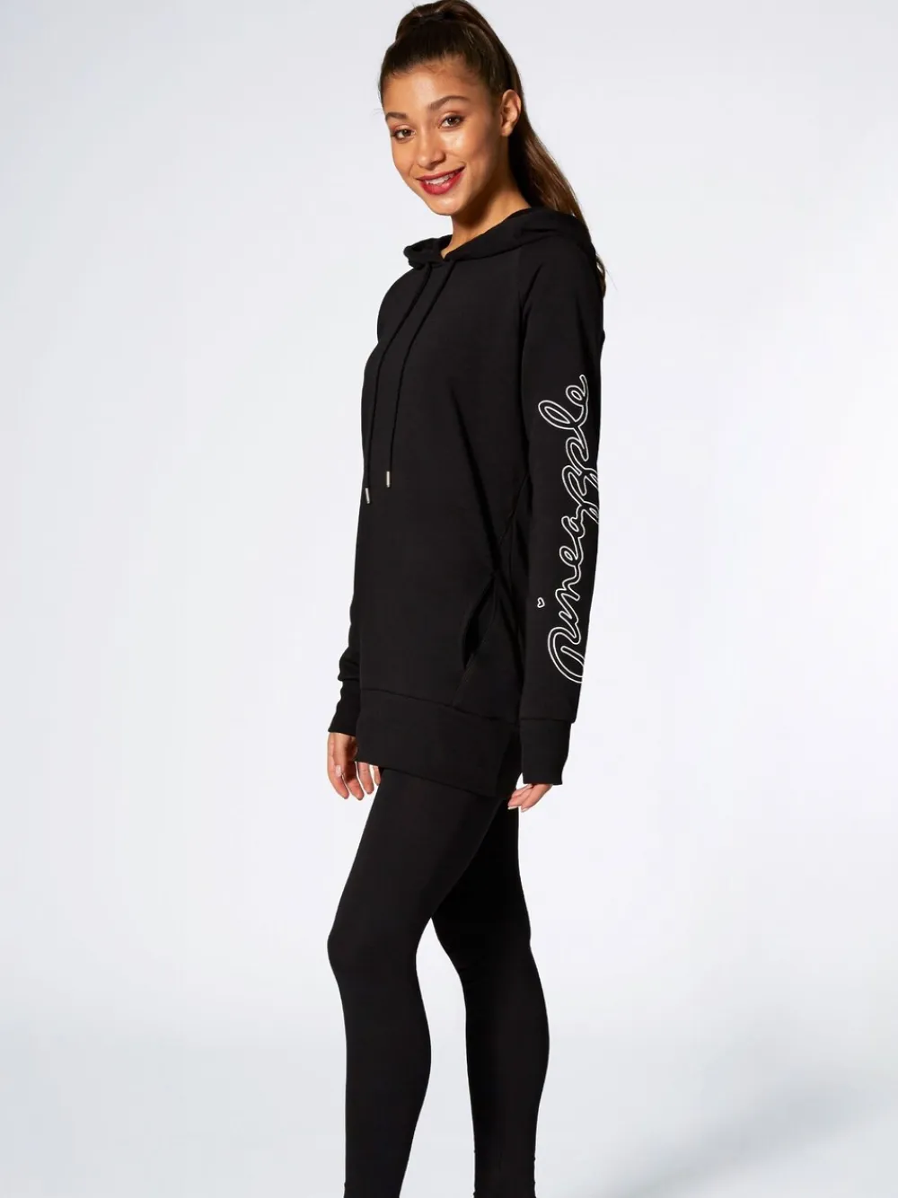 Longline hooded drawcord top with logo detail on sleeve. In soft loopback fabric and complete with concealed side pockets. Available in Black. 68% Cotton, 32% Polyester.