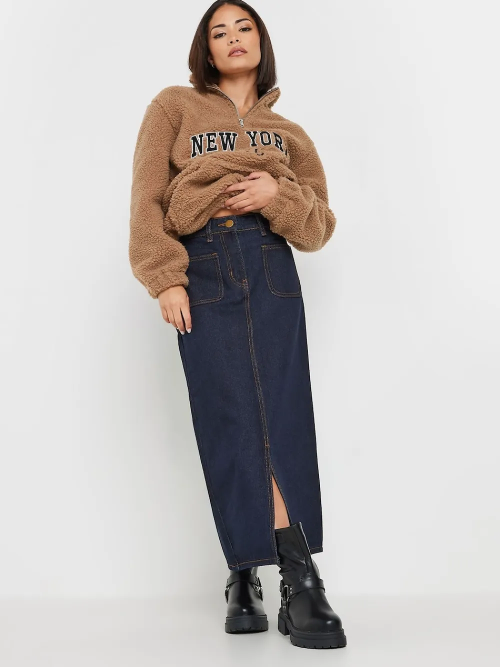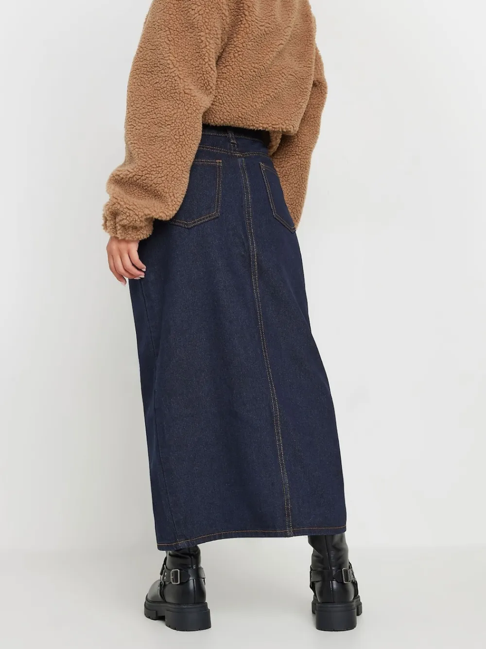 Step into the new season with this dark denim skirt. Made in a comfortable cotton fabric, it features pocket patch detailing, a front seam slit and is completed at a midaxi length. Pair with boots and an oversized jumper for a transitional look you can obsess over! Machine washable. 100% Cotton.