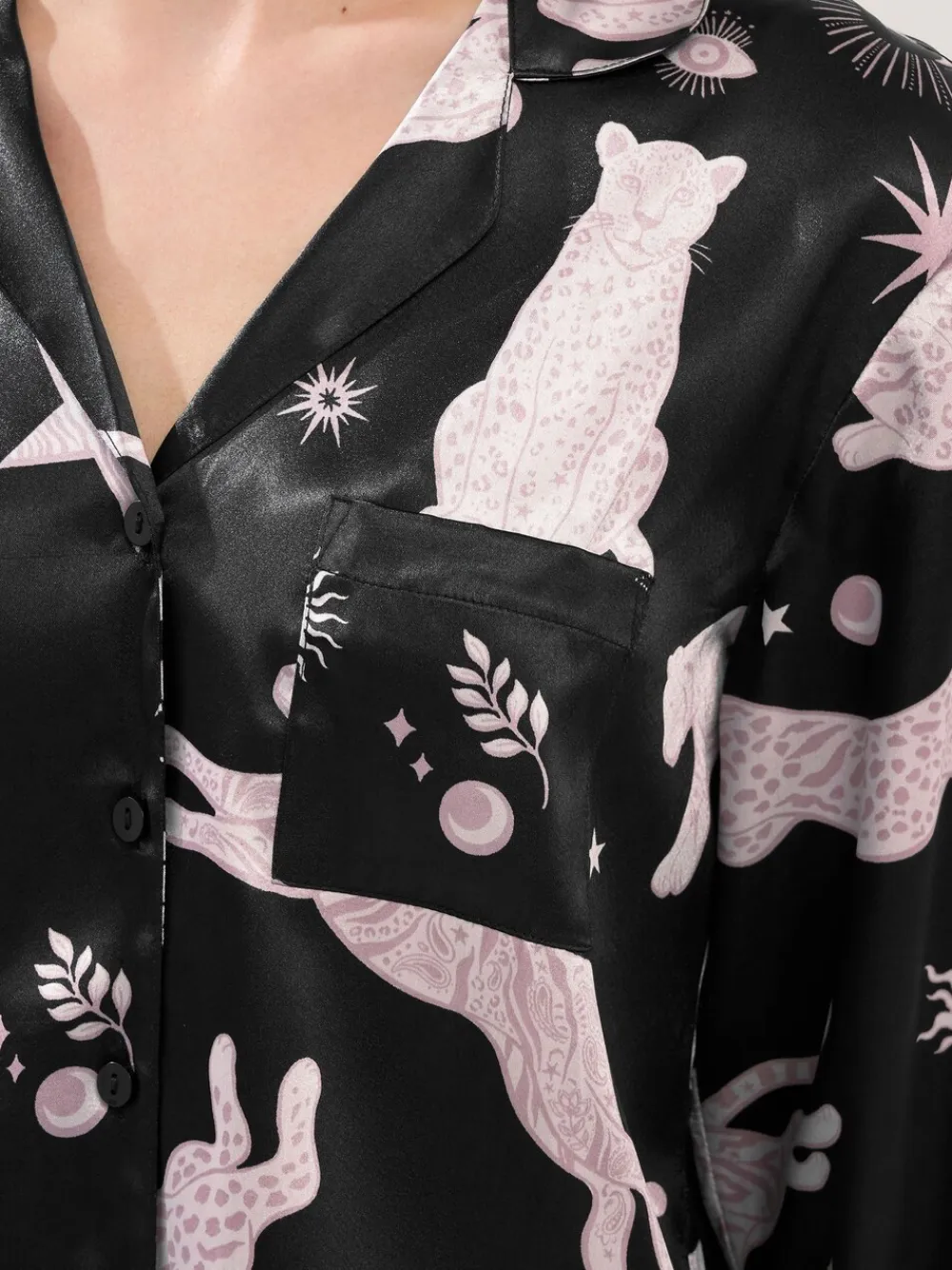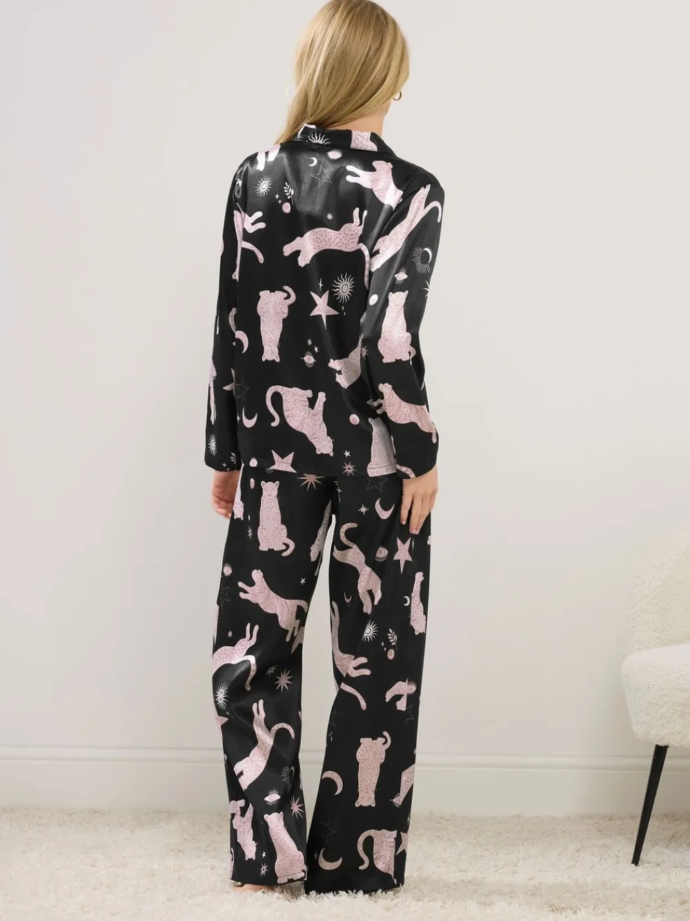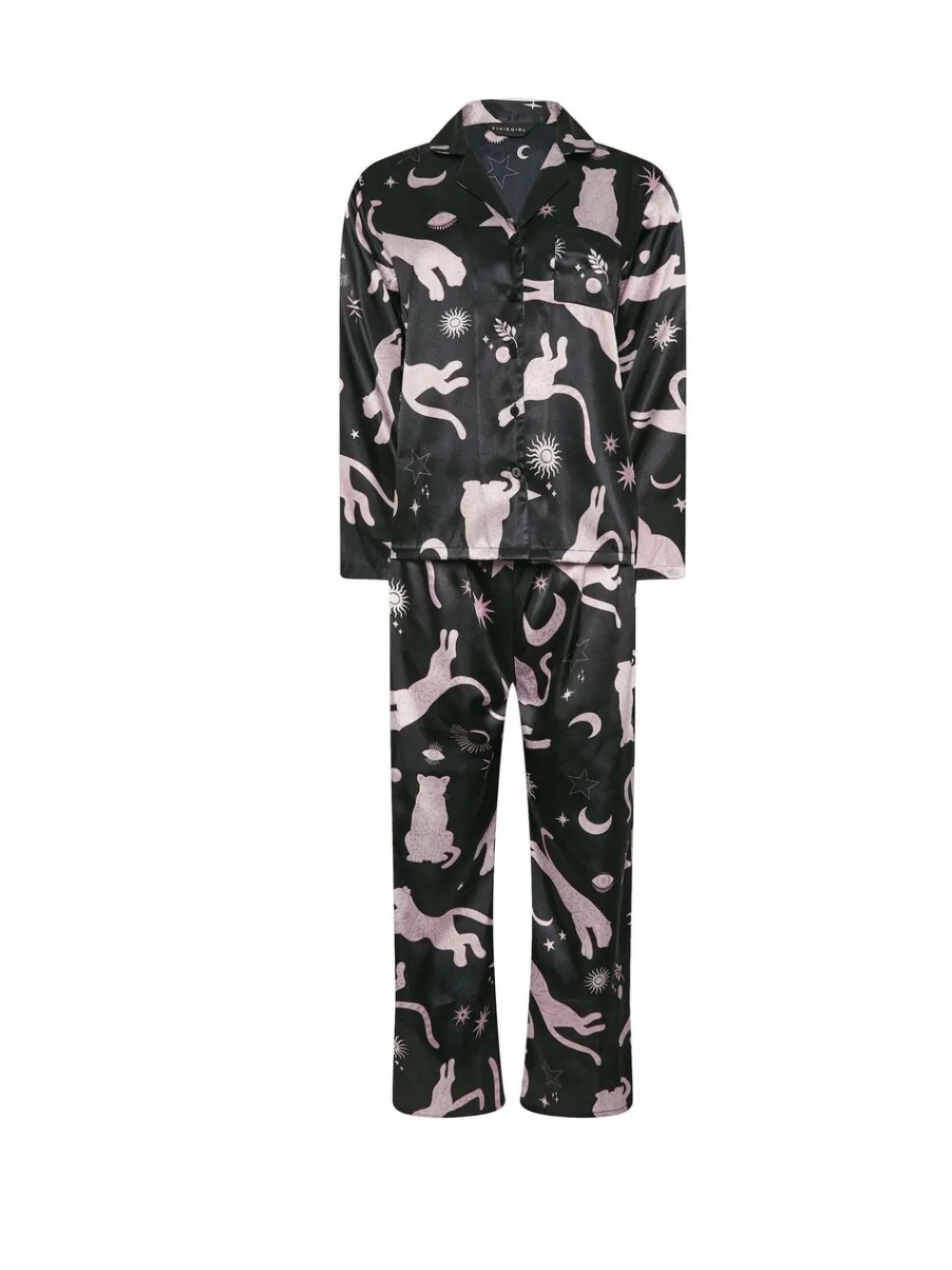 Fit & Fashion Notes: Invite luxury into your night time routine with this pyjama set. Made from a soft satin fabric, the set features a button-up shirt with a revere collar and wide leg trousers with an elasticated waistband. Wear as a pair with fluffy socks to complete the look. Features: Mixed graphic print Revere collar Button through fastenings Long sleeves Chest pocket Wide leg style Elasticated waistband Made from a soft satin fabric 100 polyester Inside seam measures: 27 Machine washable Machine washable. 100% Polyester.