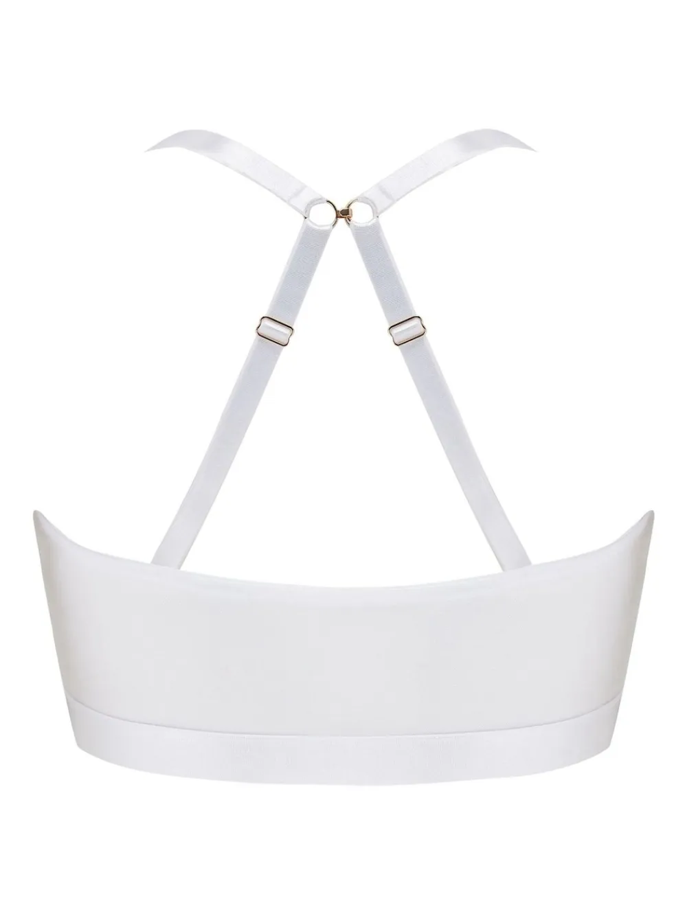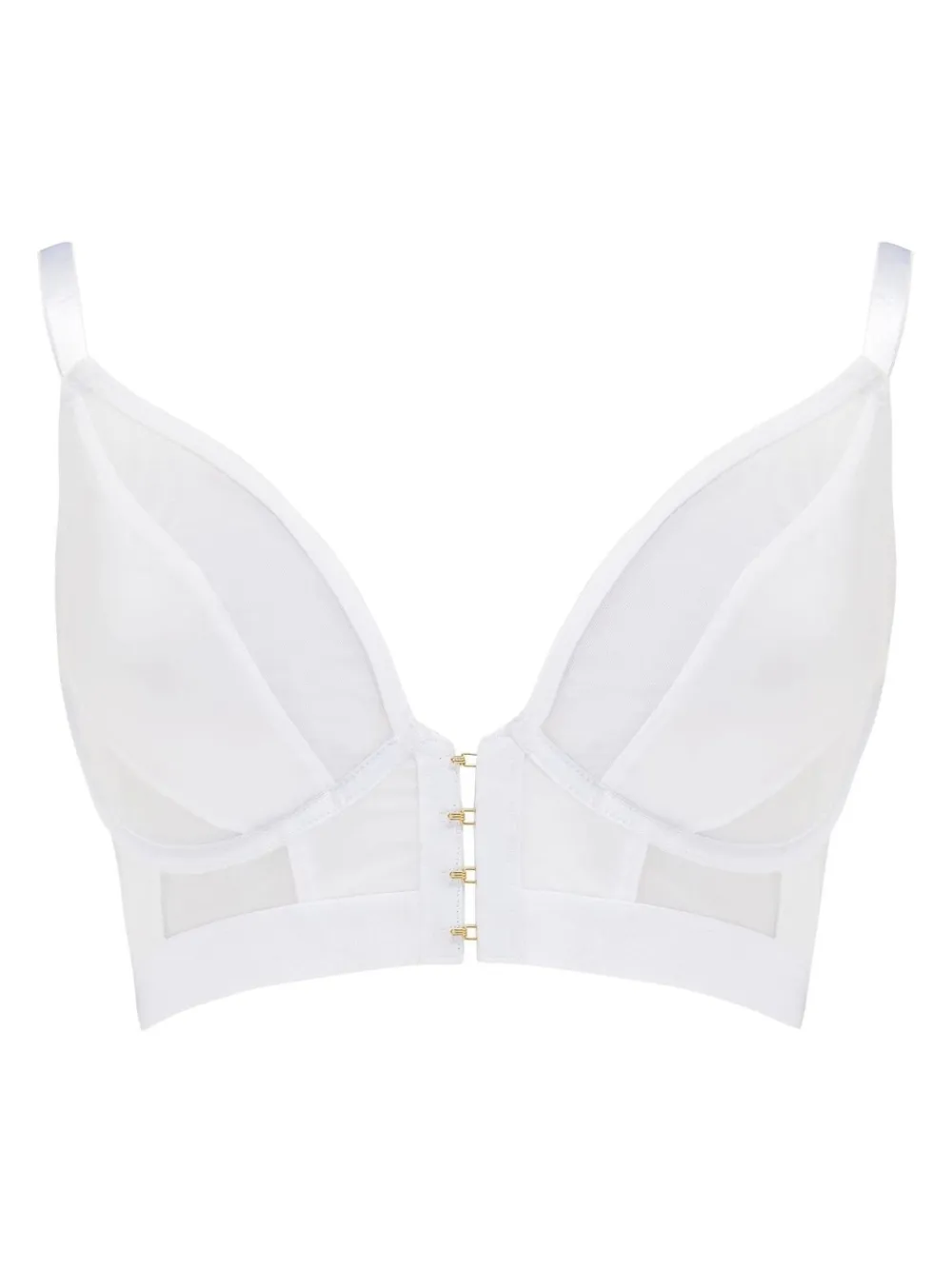 India loves worn-to-be-seen lingerie. So prepare to dazzle in this luxurious longline White bra. Far too pretty to keep under wraps, its daring mesh and fabric panels were made to show off, while the longline style and cups that start high on the shoulder straps will ensure you don’t feel too exposed. With built-in underwire to keep you firmly but comfortably in place, the deep plunge adds even more definition. Front-fastening with gold hook-and-eyes, this longline bralette shapes, supports, and looks perfect when worn with a high-waisted skirt. Hand wash only. 80% Nylon, 20% Elastane.