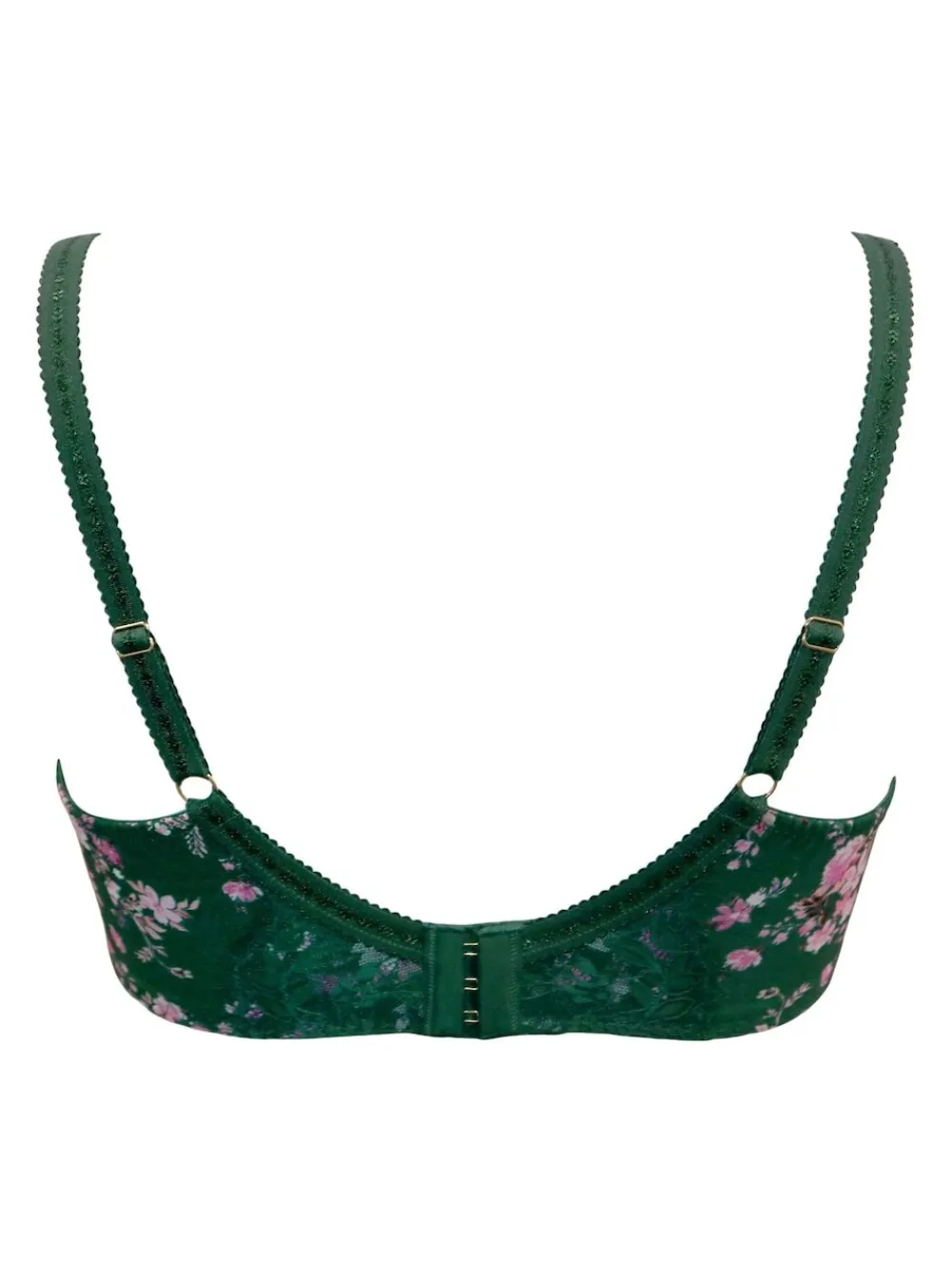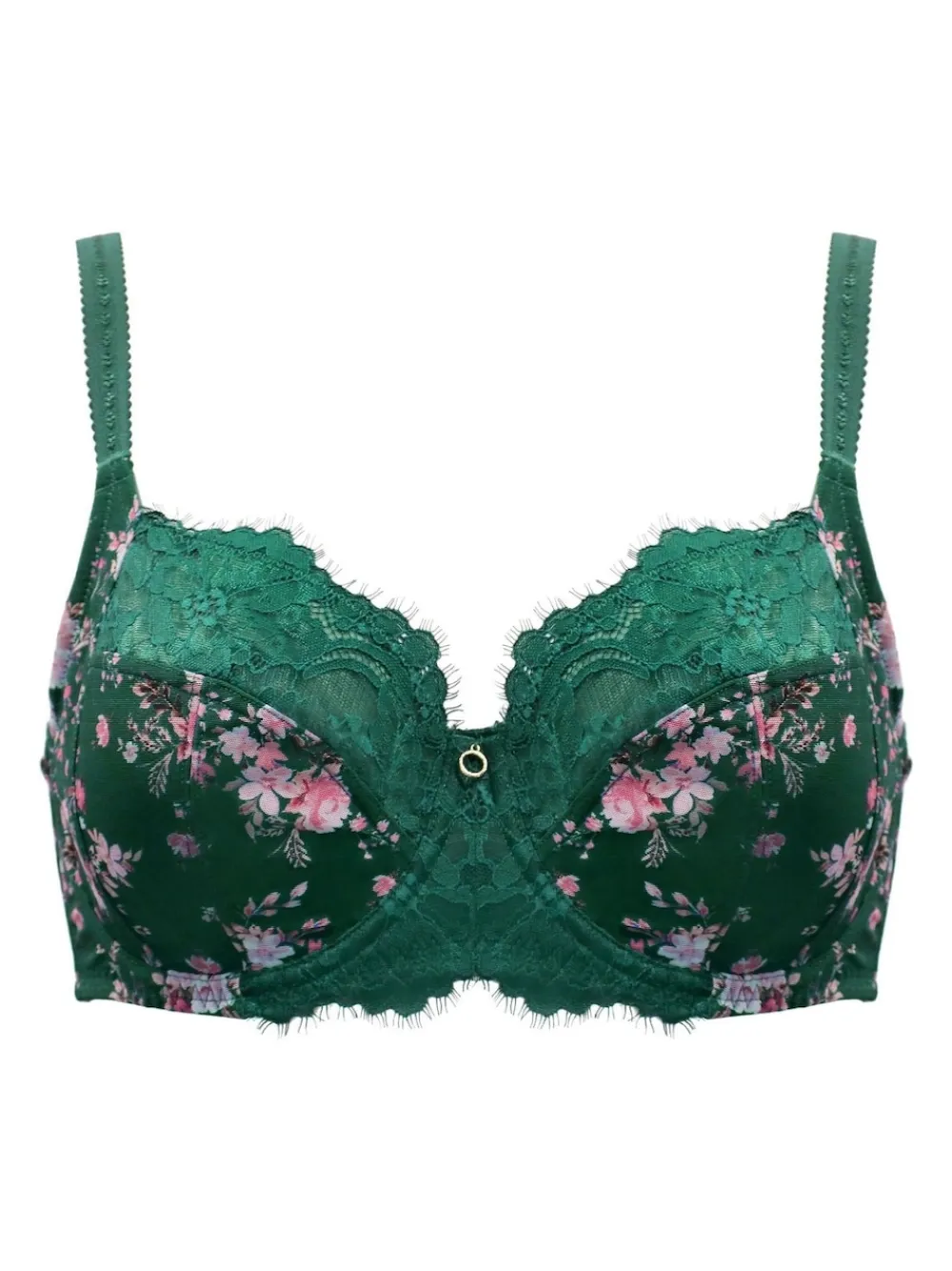Feel supported and stylish with the Pour Moi Green Bliss Printed Mesh Non-Padded Side Support Bra. Designed for D-J cup sizes, this beautiful bra offers side support and underwired cups for amazing lift and shaping—without the need for padding. The printed mesh and lace cups bring a touch of elegance, while the gold ring trinket adds a little luxe detail. With adjustable straps and a secure hook-and-eye fastening, you can find your perfect fit for all-day comfort. Hand wash only. Main 82% Nylon, 18% Elastane. Lining 100% Nylon.