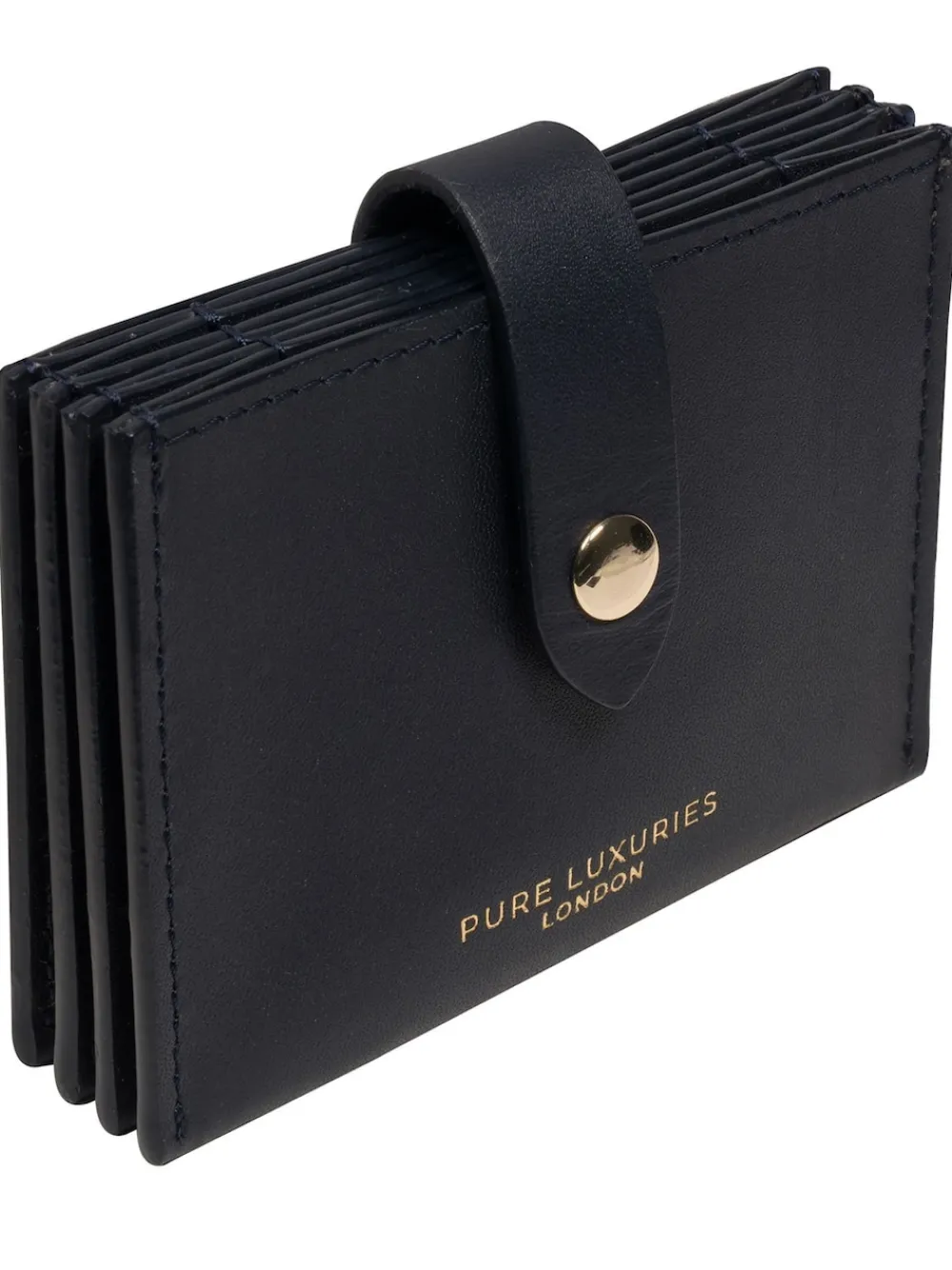 Simple, stylish and functional, the Allie card holder features a unique accordion opening design which is both eye-catching and secures your card slot. A press stud fastener adds another layer of security to this design. As part of the Pure Luxuries Fitzrovia Collection, it is inspired by the blending of modern and traditional that you find in the namesake district of London. The Pure Luxuries logo adorns the purse in gold foil which gives it a sophisticated finishing touch. Height 7cm Width 10cm Depth 2cm Main 100% Leather. Lining 100% Cotton.