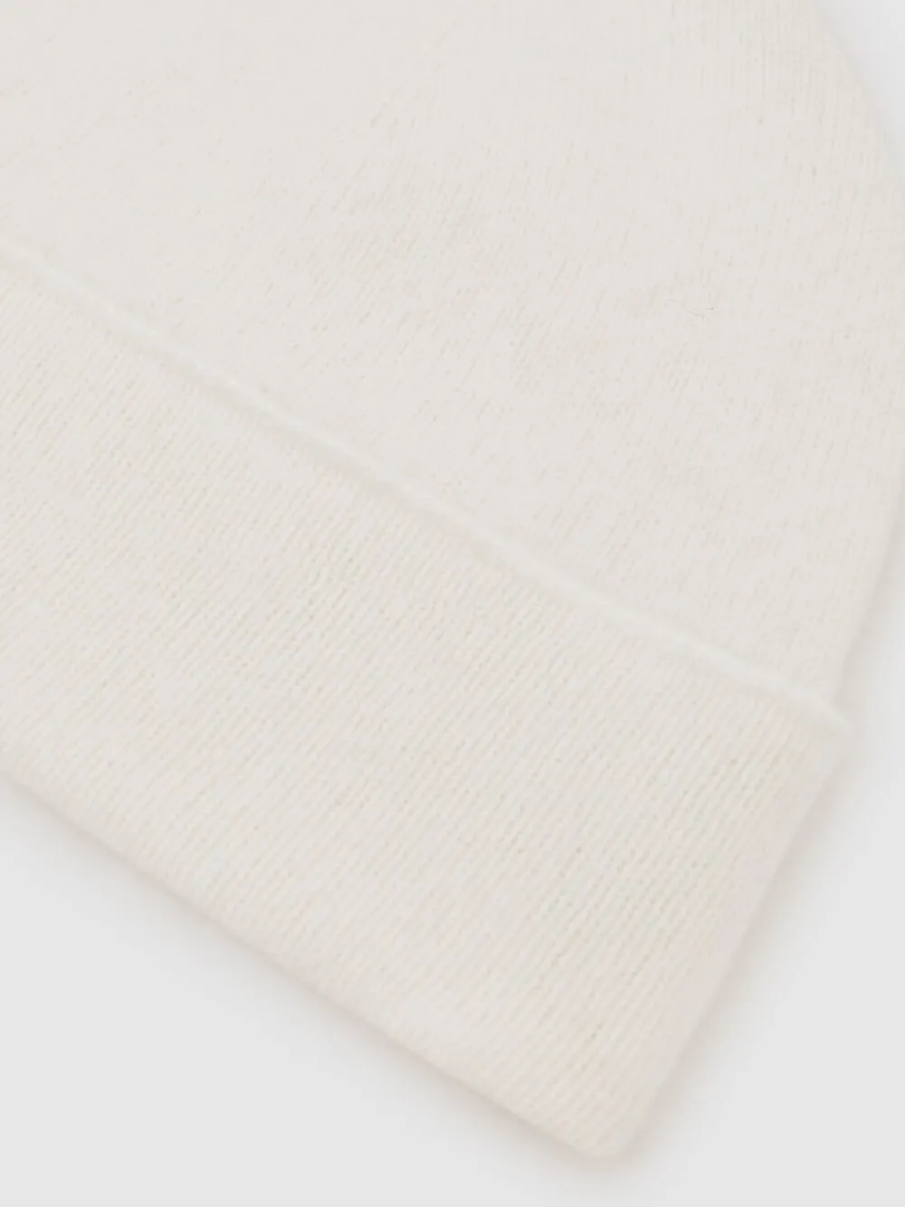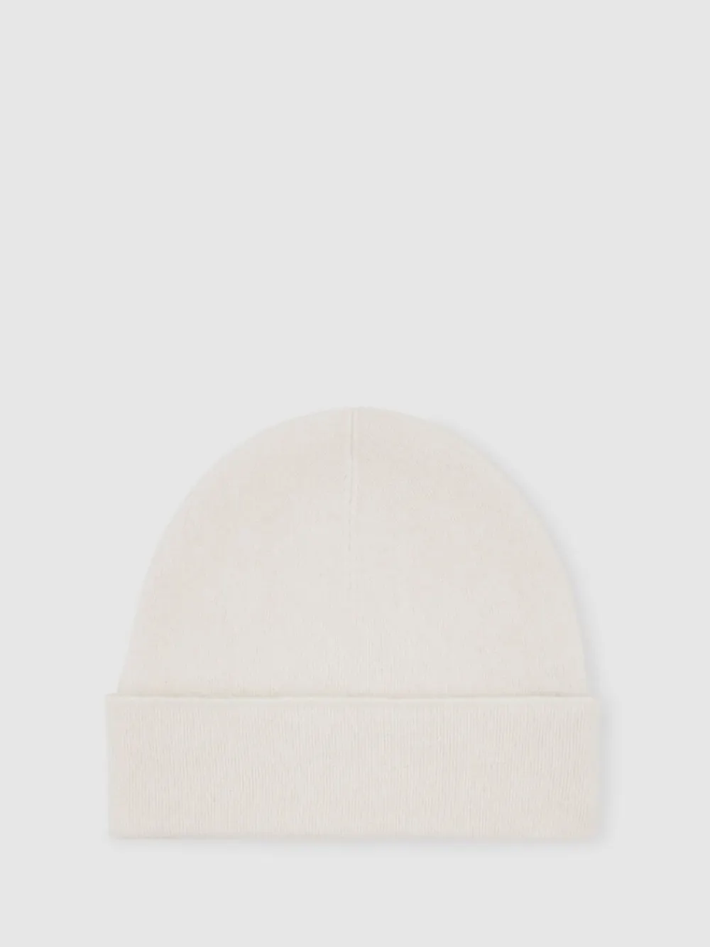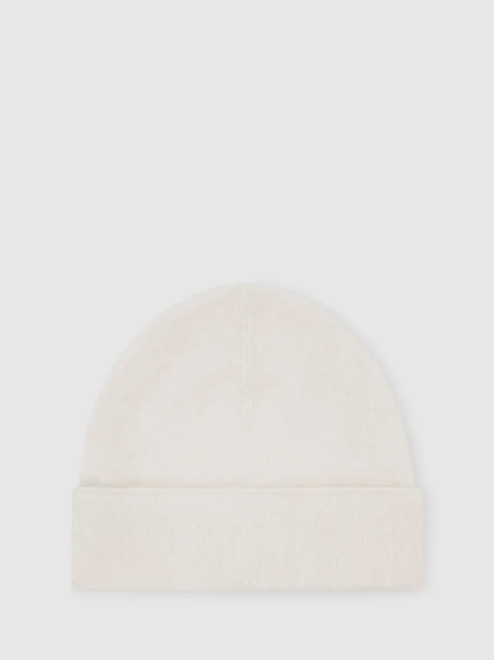 The Alba beanie is crafted from 100% cashmere, offering a luxuriously soft and lightweight feel. Its fine ribbing and turn-up design create a timeless silhouette for cold-weather layering. 100% cashmere Fine ribbing Turn-up design Hand wash only. 100% Cashmere.