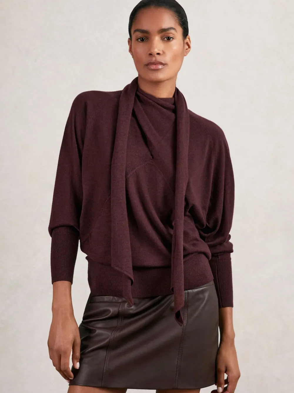The Burgundy Alexis jumper is crafted from 100% wool with a relaxed silhouette. A softly draped crossover detail defines the front and flows into a high neckline, complemented by a scarf detail that wraps the neck. 100% wool Scarf detail Crossover draping Ribbed hem and cuffs The model is wearing a size S. Measurements of model: Height 5ft 10” / 177.8cm. Hand wash only. Main 100% Wool. Control Panel 90% Wool, 8% Nylon, 2% Elastane.
