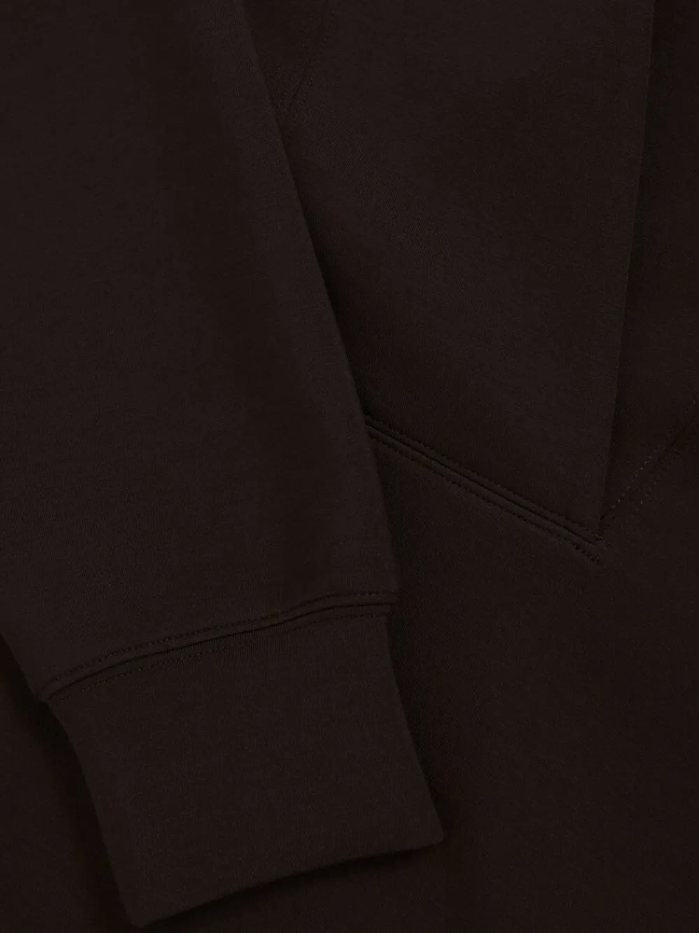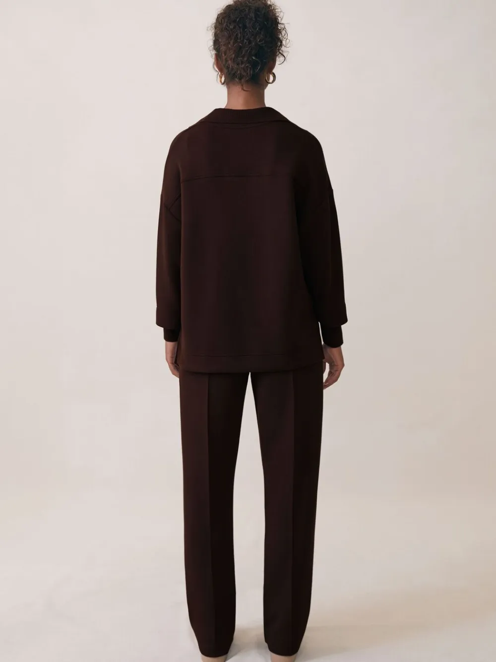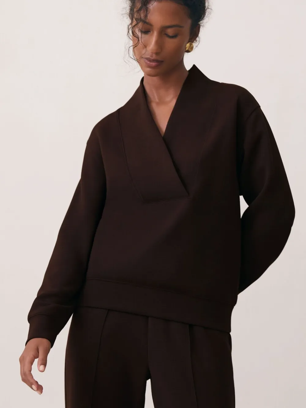 The dark chocolate Annabel sweatshirt is crafted from our premium cloud interlock jersey in a modal-blend, offering a silky-soft handle with beautiful drape. A deep shawl-style neckline and elasticated trims lend a refined edge to its relaxed, leisurewear-inspired silhouette. Modal blend premium interlock jersey with stretch Heavyweight jersey Shawl-style neckline Drop shoulders Long sleeves The model is wearing a size S Measurements of Model: 5ft9 / 175cm Machine washable. 49% Modal, 46% Polyester, 5% Elastane.