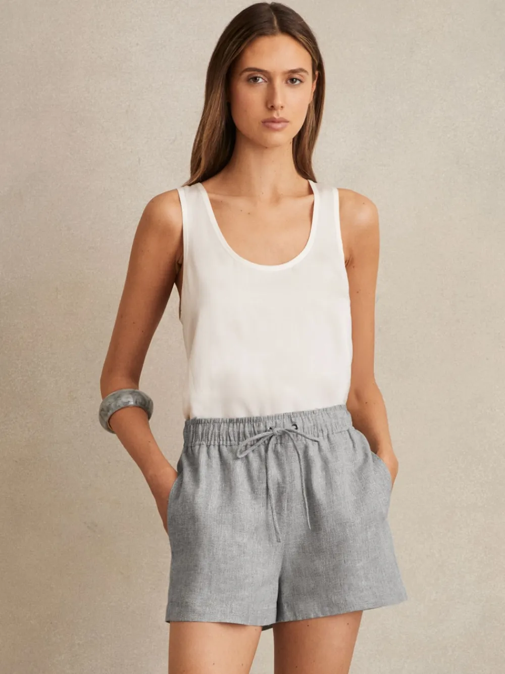 A lightweight style in a linen blend, the Willow shorts are perfect for warmer weather. They’re fitted with a comfortable elasticated drawstring waistband and elevated by a lightly speckled weave. Linen blend Elasticated drawstring waist Side slip pockets The model is wearing a size 8. Measurements of model: Height 5ft 10” / 178cm. Regular inside leg length 2.5″ / 6cm. Machine washable. 88% Linen, 12% Nylon.