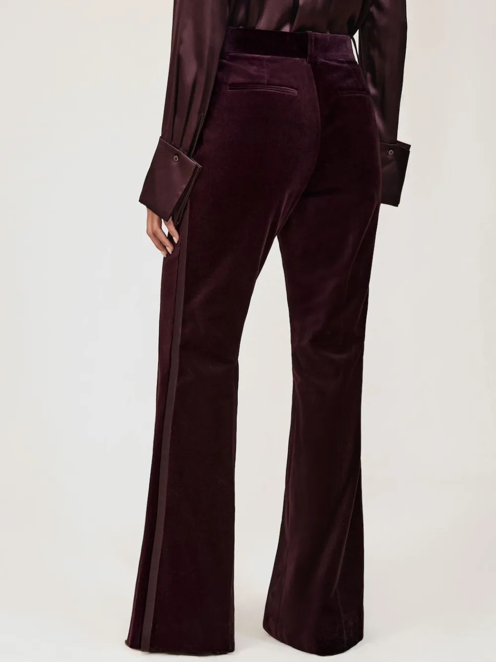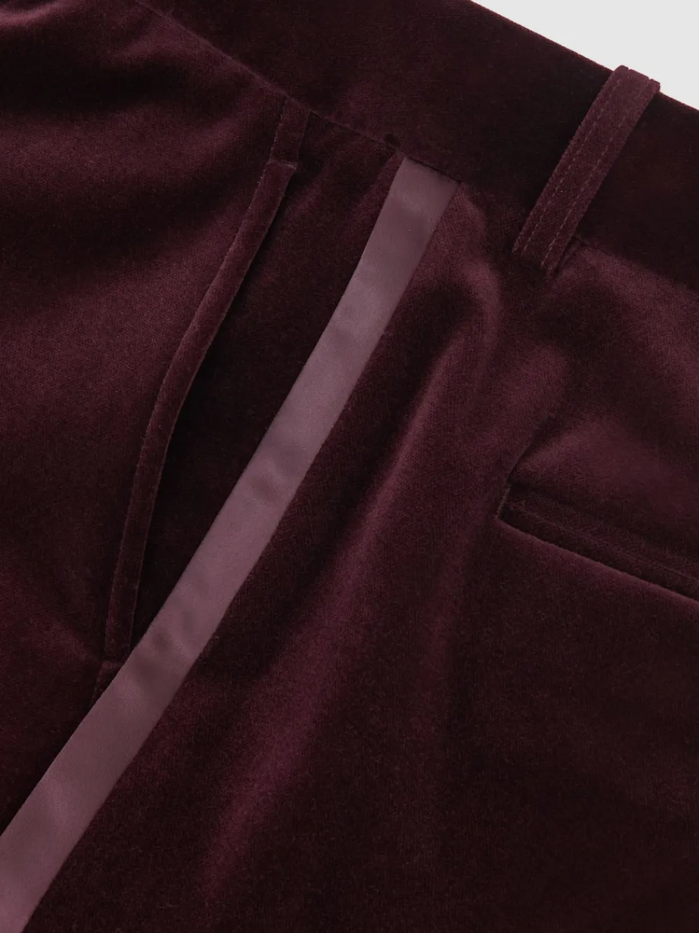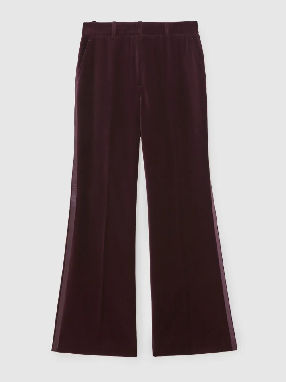 The Burgundy Elia trousers are crafted from plush velvet for a luxurious evening-ready feel. A flared silhouette is elevated by tuxedo-style satin side stripes, combining sleek tailoring with subtle statement detail. Velvet Flared leg Satin side stripe Angled side pockets Hook-and-bar with zip The model is wearing a size 8. Measurements of model: Height 5ft 9” / 175cm. Dry clean only. 100% Cotton.