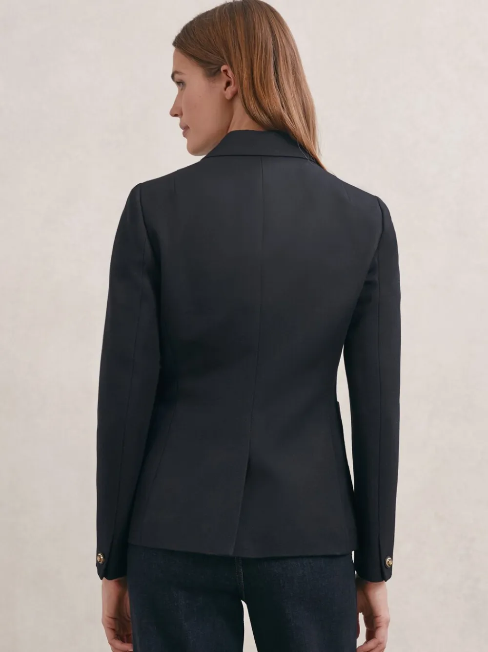 The Gigi blazer is expertly tailored from wool-blend twill to a double-breasted silhouette with a front cutaway. It’s finished with peak lapels, patch pockets, and crest-detailed buttons. Wool-blend twill. Double-breasted. Peak lapels. Crest-detailed buttons. Front cutaway. Patch pockets. The model is wearing a size 8 Measurements of model: Height 5ft10′ / 177CM Regular centre back neck to hem 25.5″ / 65cm. Dry clean only. 50% Wool, 30% Viscose, 20% Polyester.
