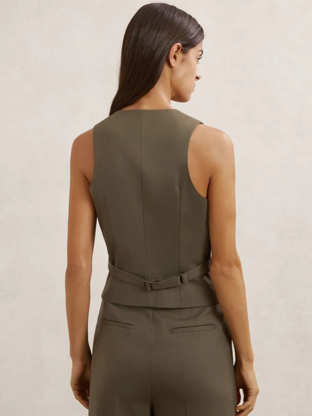The Solene waistcoat is tailored from a wool-blend with a touch of stretch for a refined, structured finish. Its single-breasted design features a button-through front and double-welt pockets, while an adjustable back strap allows for a custom fit.Wool blendSingle-breastedDouble-welt pocketsAdjustable strap to reverseFront buttons Wipe clean only. 66% Wool, 32% Polyester, 2% Elastane.