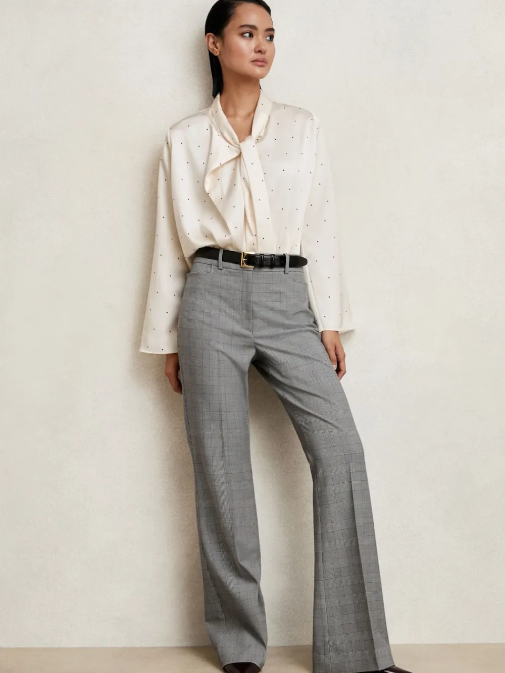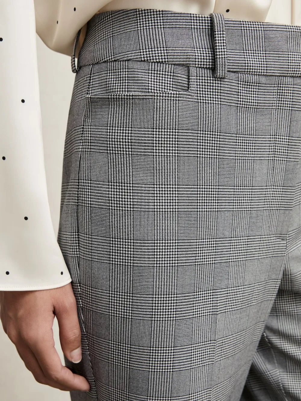 Expertly crafted from premium suiting in a classic Prince of Wales check, the Brooklyn trousers are a perfect choice for refined occasions. They’re tailored to a flared leg, with pressed creases that sharpen the silhouette. Prince of Wales check Flared Front pockets Double hook-and-bar with zip The model is wearing a size 8 Measurements of model: Height 5ft 9′ / 175cm Dry clean only. 68% Polyester, 29% Viscose, 3% Elastane.