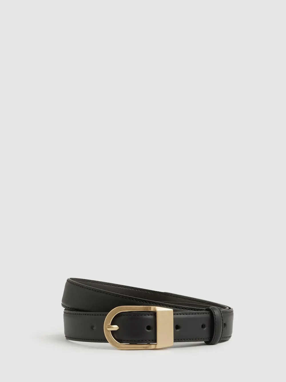 The Black Hazel belt is crafted from smooth leather for a refined finish. Its curved metal buckle adds a touch of timeless simplicity, making it a versatile wardrobe staple. 100% Leather Curved buckle fastening Width 3.5cm 100% Leather.