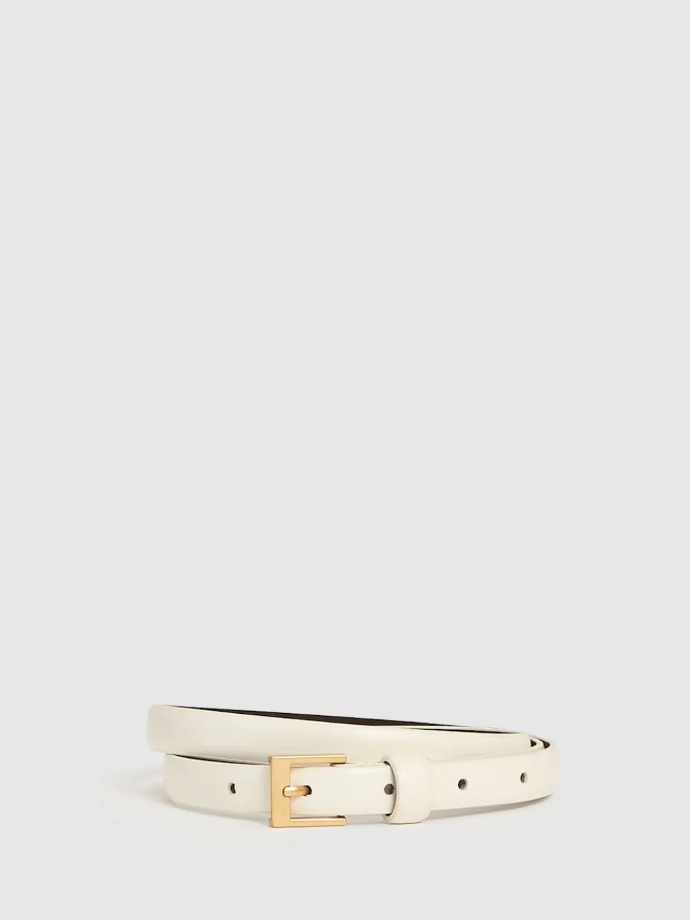Smooth off-white leather is cut into a thin construction with a gold-tone buckle for the Holly belt. Leather Thin construction Gold-tone buckle Width 1.5cm 100% Leather.