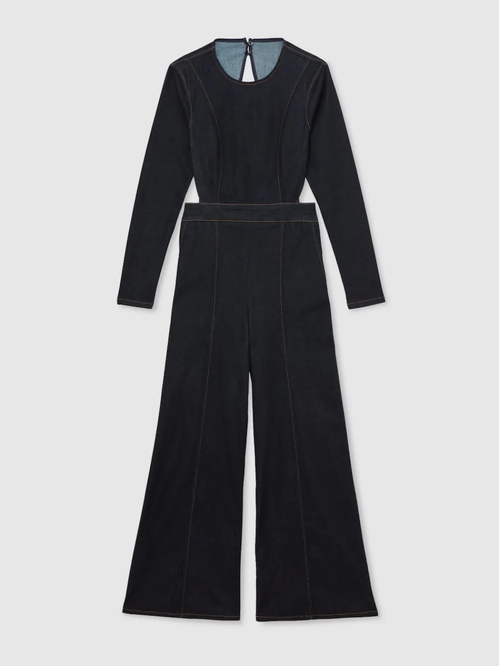 The Sanata denim jumpsuit is defined by its wide-leg silhouette and open back. It’s finished with long sleeves and contrast topstitching.DenimWide legOpen back cut-outContrast topstitchingRound necklineSide slip pocketsButton-and-loop closure with concealed back zip Regular inside leg length 32″ / 81cm. Machine washable. 43% Viscose, 33% Cotton, 17% Lyocell, 5% Polyester, 2% Elastane.