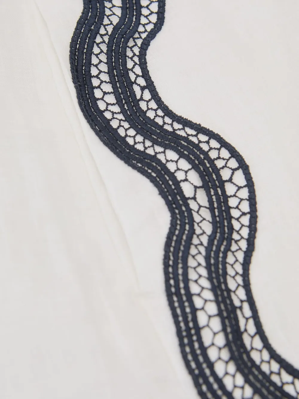 Perfect for warm weather, the Felicity shorts are crafted from 100% linen with lacy scallop trims at the sides. A topstitched waistband and subtle pintucks add a refined finish.100% linenEmbroidered lace scallop trimTopstitched waistbandHigh waistFront pintucksSide slip pocketsBack welt pocketConcealed button with zip Regular inside leg length 2″ / 5cm. Machine washable. 100% Linen.