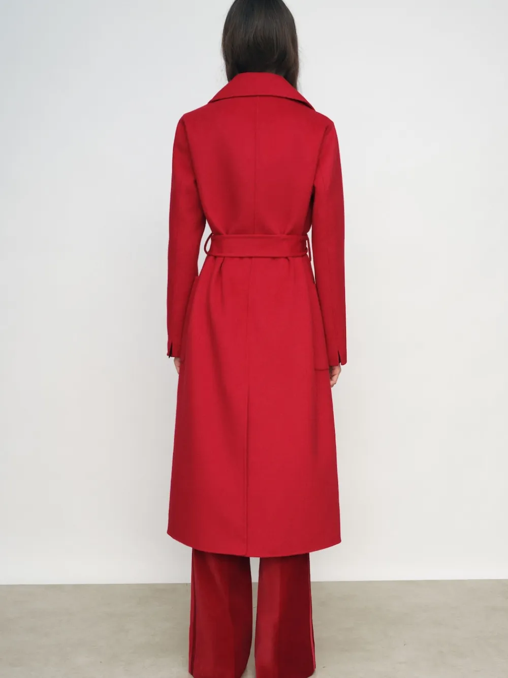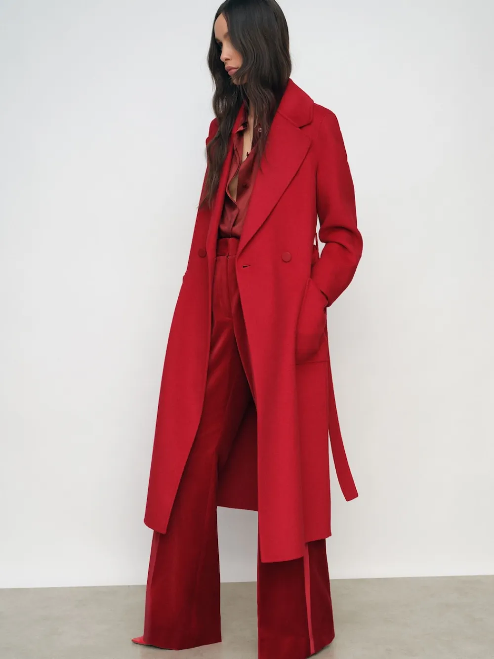 The Red Lucia coat is tailored from a double-faced wool blend with blind seams and no lining, offering the same smooth, premium feel inside and out. Its double-breasted silhouette is secured with two buttons and a self-tie belt, balancing structure with fluidity. Wool blend Blindseam construction Self-tie waist belt Vent to reverse Relaxed fit Unlined The model is wearing a size 8 Height: 5’10ft / 177.8 cm Regular centre back neck to hem 47.5″ / 121cm. Dry clean only. 66% Wool, 34% Recycled polyester.