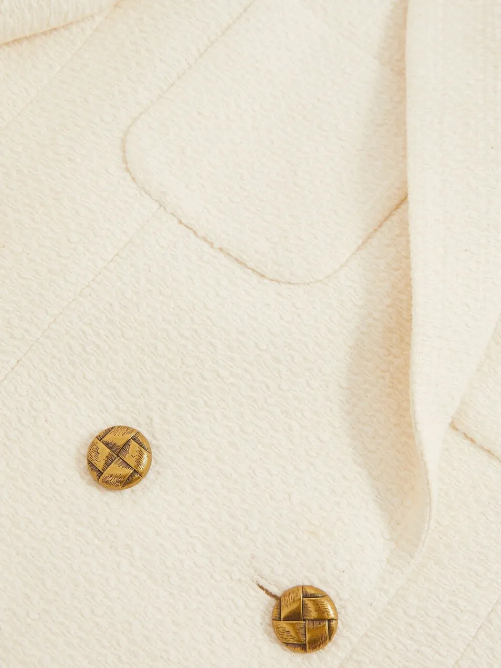 The White Mia blazer is tailored in a cropped silhouette with a tactile, textured finish, woven with wool and cotton. Padded shoulders and a double-breasted front enhance its sharp profile, while gold-tone basket-weave buttons add a vintage-inspired accent. Crafted with wool and cotton Textured finish Double-breasted Padded shoulders Gold-tone woven buttons Cropped The model is wearing a size 8. Measurements of model: 5ft 9.5” / 176.5cm. Regular centre back neck to hem 19.5″ / 50cm. Dry clean only. 48% Polyester, 20% Wool, 19% Cotton, 13% Acrylic.