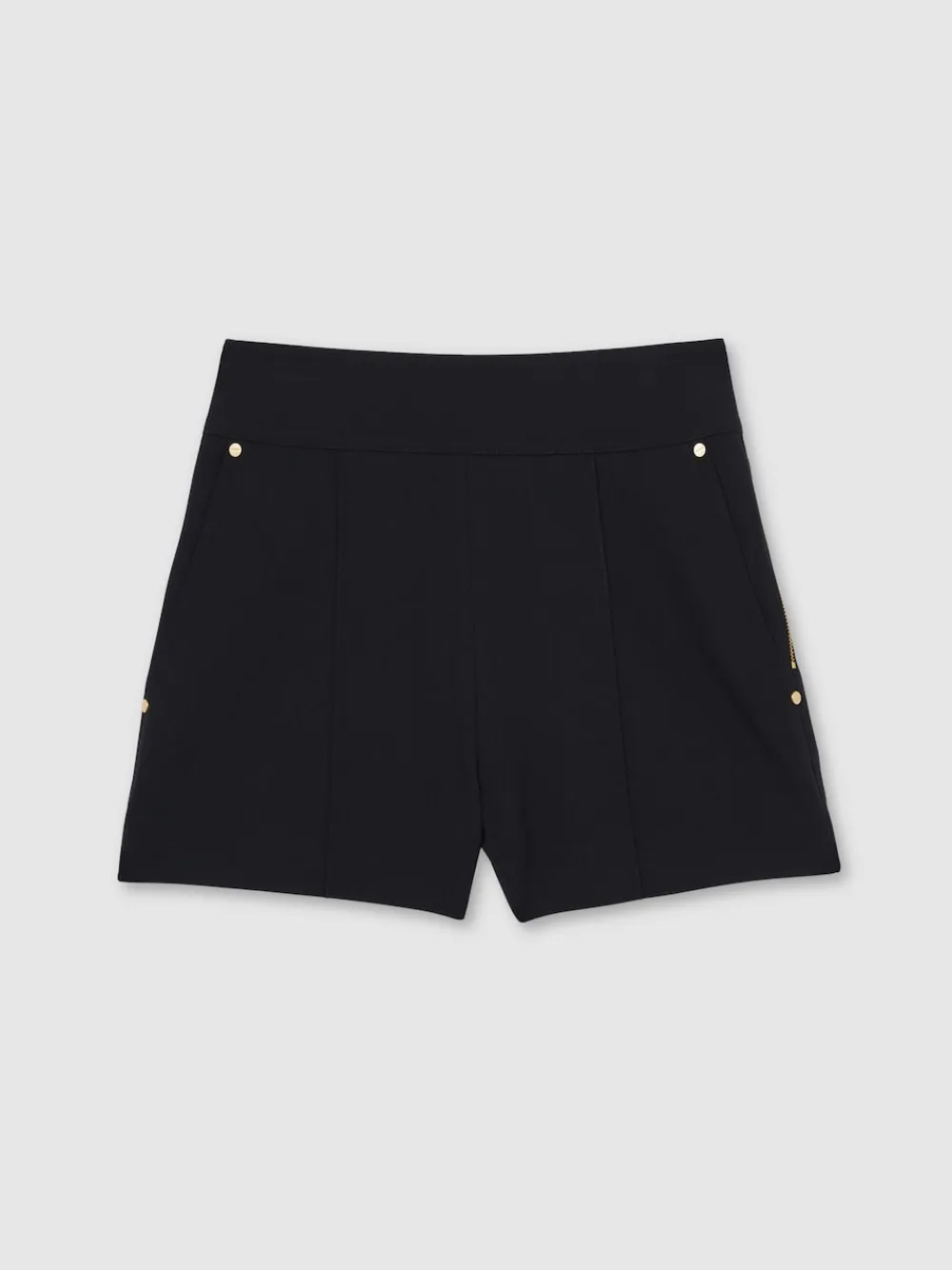 The Immie shorts blend sharp tailoring with refined detailing. Gold-tone logo-engraved studs accent the angled side pockets, while central pintucks add elegant structure to the front. Logo-engraved studs Front pintucks Angled side pockets Welt pockets to reverse Side zip with press-stud tab The model is wearing a size 8. Measurements of model: 5ft 9.5” / 176.5cm. Regular inside leg length 3″ / 7cm. Machine washable. 69% Polyester, 25% Viscose, 6% Elastane.