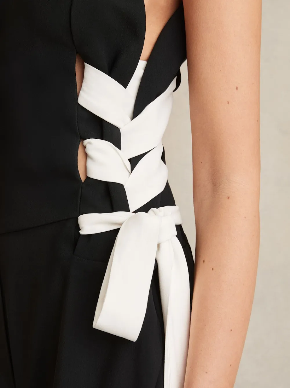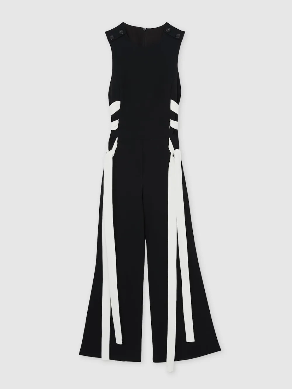 Defined by bold lace-up detailing, the Emma jumpsuit reimagines a classic wide-leg silhouette with a modern edge. Long, contrasting straps weave through the sides, creating a striking focal point, while buttoned shoulders add a refined, structured touch. Wide leg Lace-up sides Buttoned shoulders Side slip pockets Concealed zip to reverse The model is wearing a size 8. Measurements of model: Height 5ft 10” / 178cm. Regular inside leg length 32.5″ / 82cm. Dry clean only. 97% Viscose, 3% Elastane.