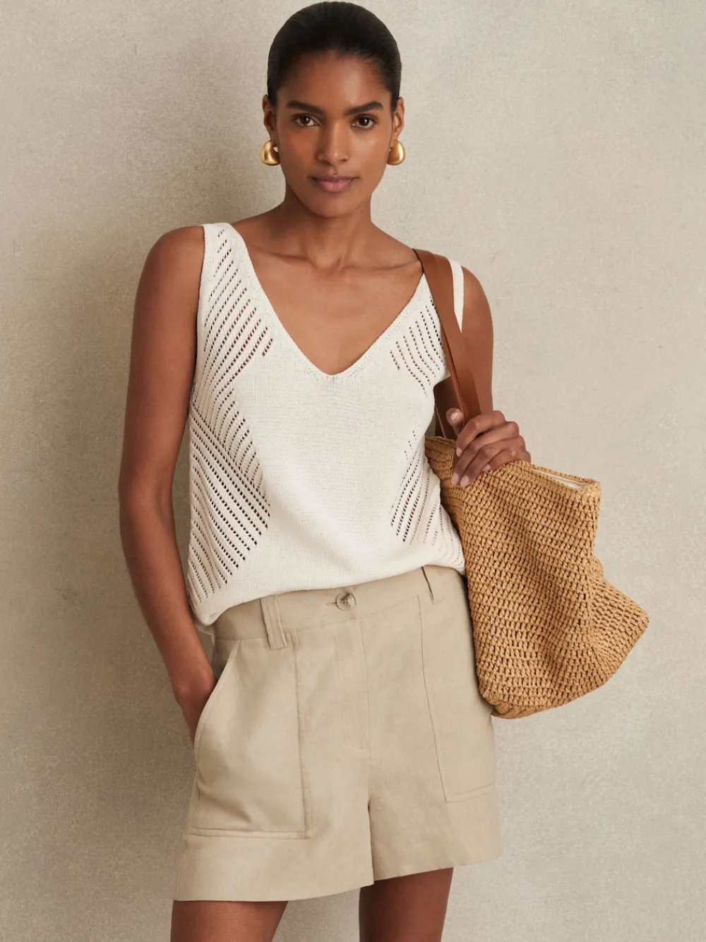 The Neutral Ashby shorts are defined by a wide-leg silhouette, offering a relaxed, off-duty feel. Crafted from 100% linen for lightweight comfort, they’re elevated by contrasting tortoiseshell buttons that enhance their effortless holiday appeal. 100% linen Side slip pockets Side buttoned pockets Patch pockets to reverse Front button and zip Belt not included The model is wearing a size 8. Measurements of model: Height 5ft 10” / 178cm. Regular inside leg length 3″ / 8cm. Machine washable. 100% Linen.