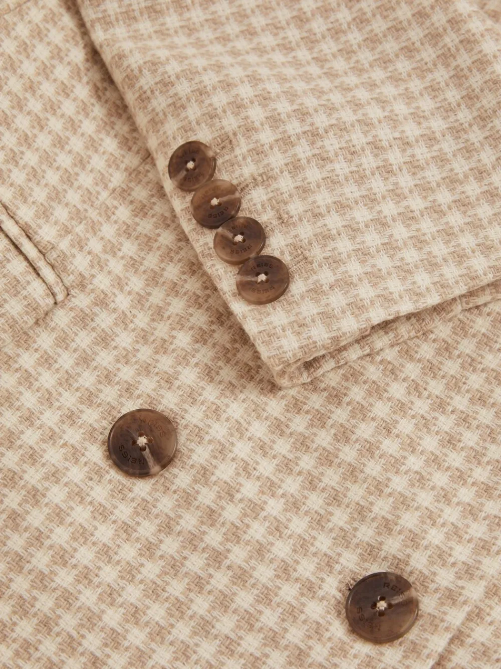 The Bella blazer is crafted from a wool-cotton blend in a woven houndstooth check fabric, offering a sophisticated and tactile feel. Its double-breasted design, peak lapels, and shoulder padding define a sharp, tailored silhouette. Crafted with wool and cotton Double-breasted Woven houndstooth check Peak lapels Shoulder padding Flap pockets Single vent to reverse The model is wearing a size 8. Measurements of model: Height 5ft 10” / 178cm. Regular centre back neck to hem 28.5″ / 72cm. Dry clean only. 39% Wool, 25% Polyester, 25% Cotton, 6% Nylon, 5% Other fibres.