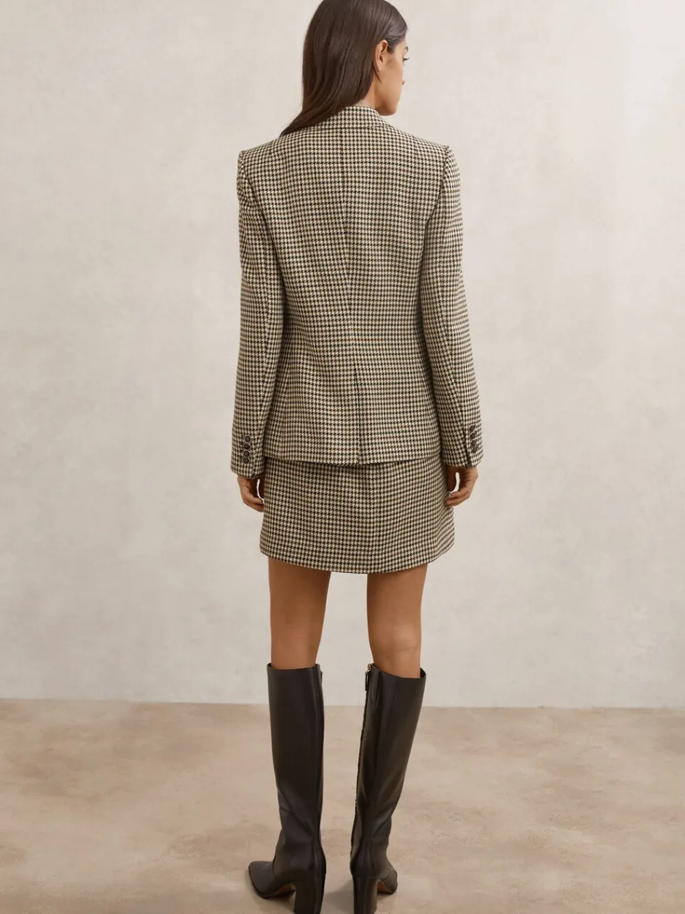 The Hartley neutral check blazer is tailored from a wool blend in a classic houndstooth check. It’s cut to a double-breasted silhouette with peak lapels, a cutaway front and a six-button fastening. Wool blend Houndstooth check Double-breasted Peak lapels Button cuffs Full lining Flap welt pockets The model is wearing a size 8 Measurements of Model: 5ft9 / 175cm Petite centre back neck to hem 24.5″ / 62cm. Dry clean only. 50% Wool, 50% Polyester.
