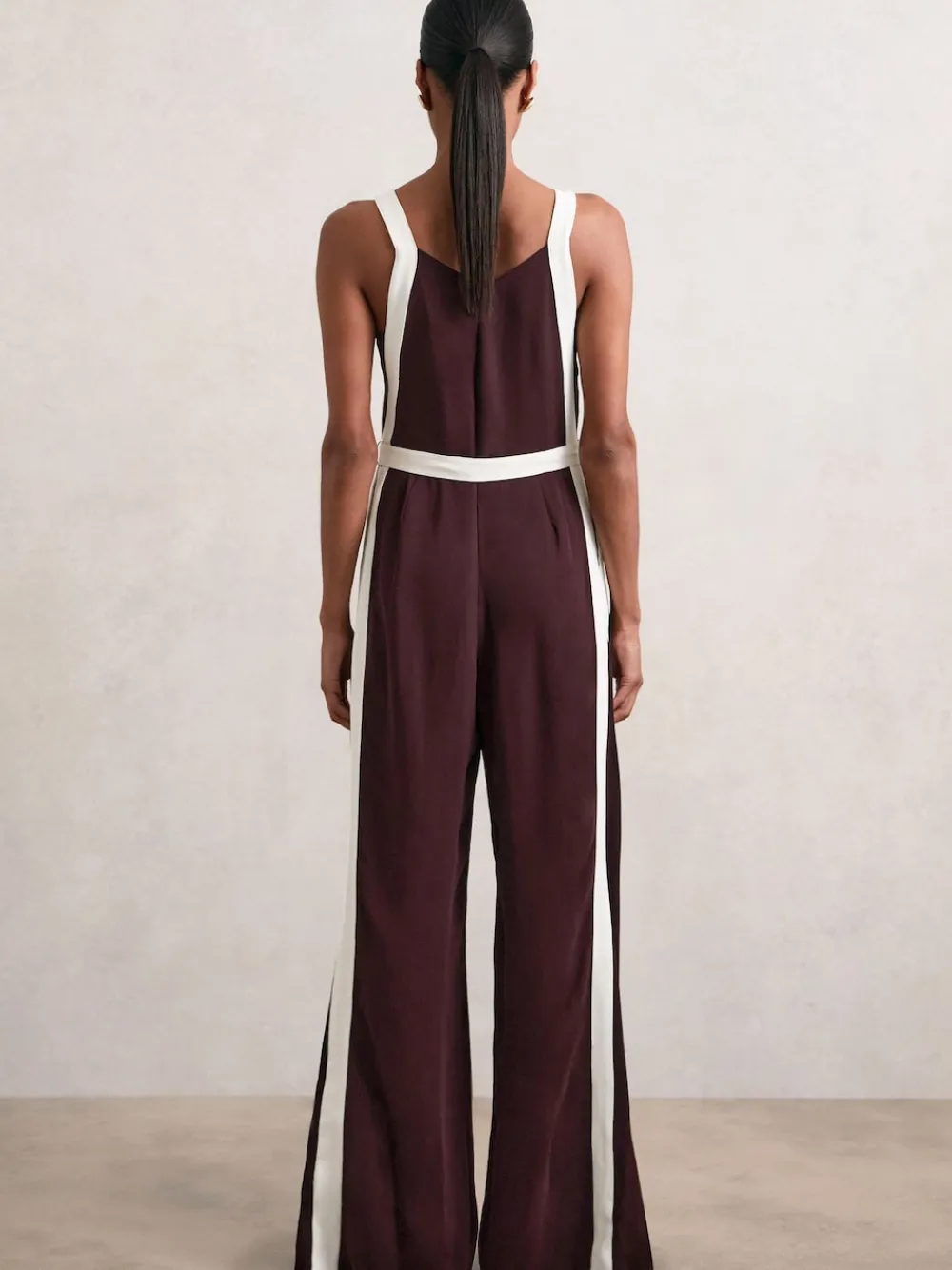 Contrasting stripes frame the sleeveless silhouette of the Burgundy/Cream Salma jumpsuit, extending down the wide legs to create a sleek colour-block effect. It’s crafted from fluid crepe and cinched at the waist with a coordinating self-tie belt. Crepe fabrication Wide leg Contrasting trim Self-tie belt Concealed zip to reverse The model is wearing a size 8. Measurements of model: Height 5ft 10” / 177.8cm. Dry clean only. Main 100% Viscose. Lining 100% Viscose.