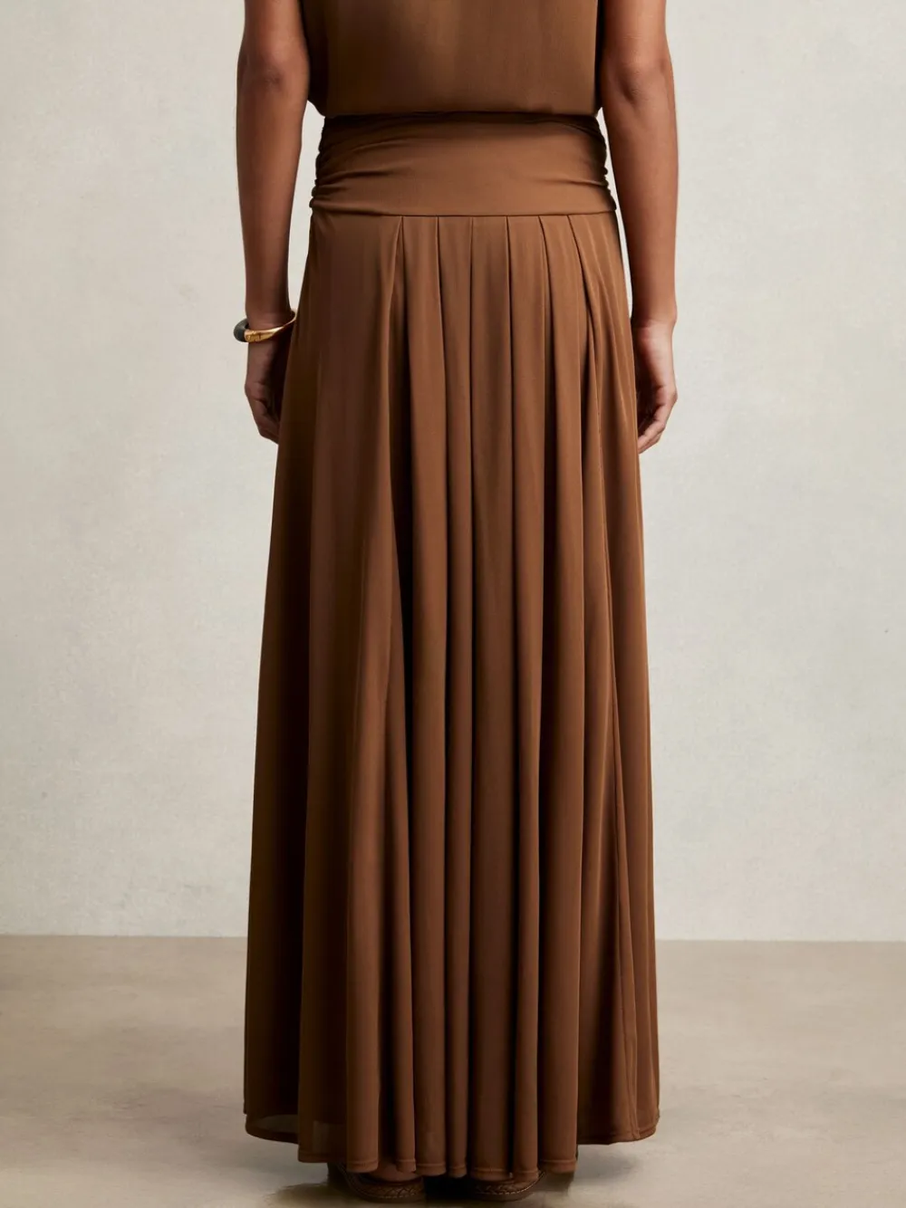 Layers of semi-sheer jersey fall through a ruched waistband and soft pleats, giving the Saffron maxi skirt a romantic, fluid drape. A concealed zip secures at the side. Semi-sheer jersey fabric Ruched waistband Pleating Concealed side zip The model is wearing a size 8. Measurements of model: 5ft 9” / 175cm. Machine washable. 100% Polyester.
