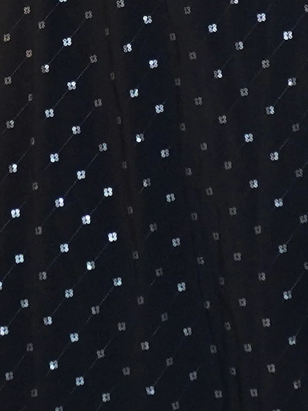 The Mila Dress is a striking bandeau maxi style cut on the bias for a sleek fit. Made from matt black crepe and covered in all-over sequins flower clusters, it catches the light with every step. Effortless yet impactful, this is your go-to for going out—modern, flattering, and made to shine all night. The model wears a size UK 10. Length from the top: 135 cm. Regular side neck to hem 53″ / 135cm. Hand wash only. 100% Polyester.