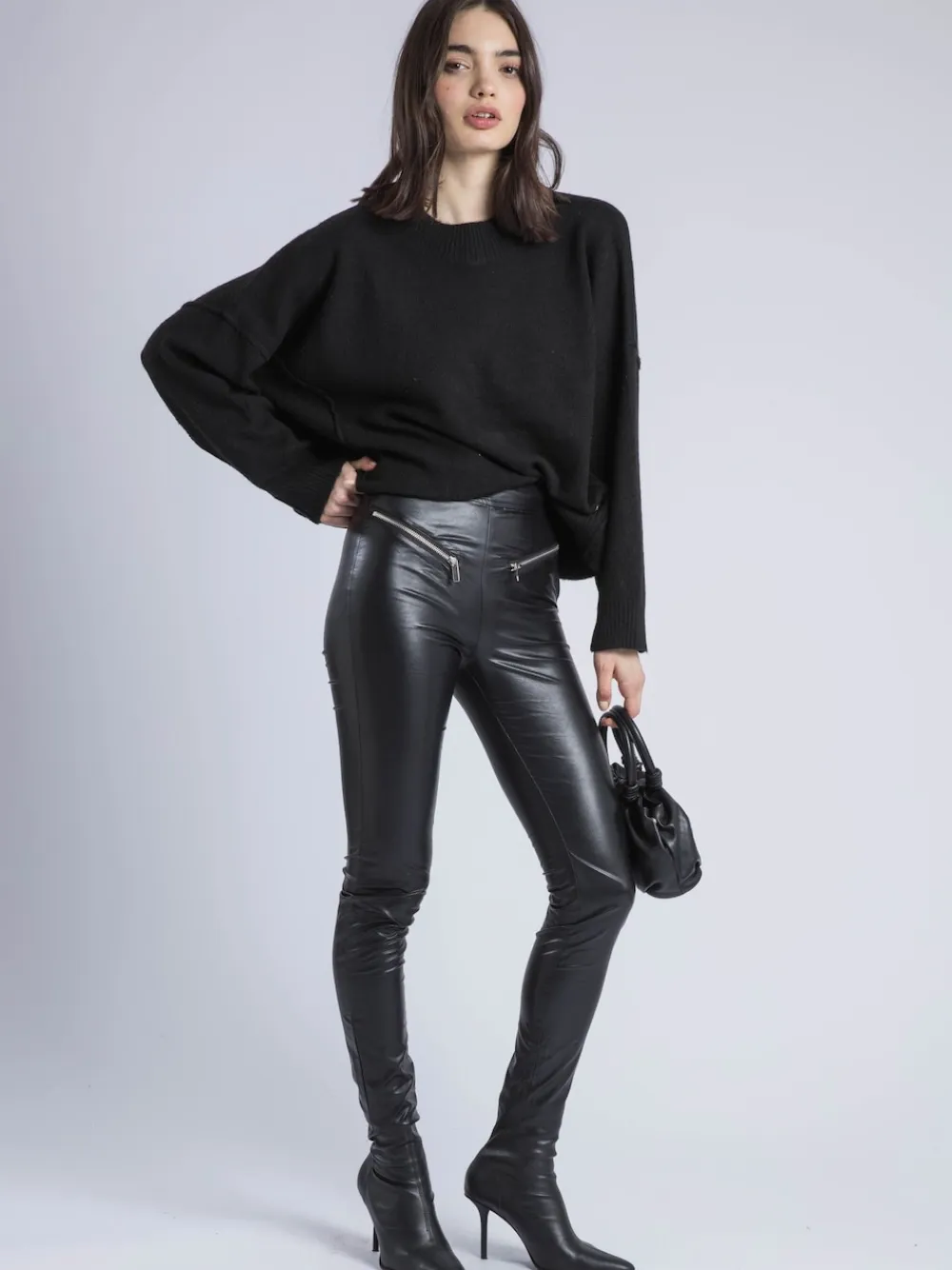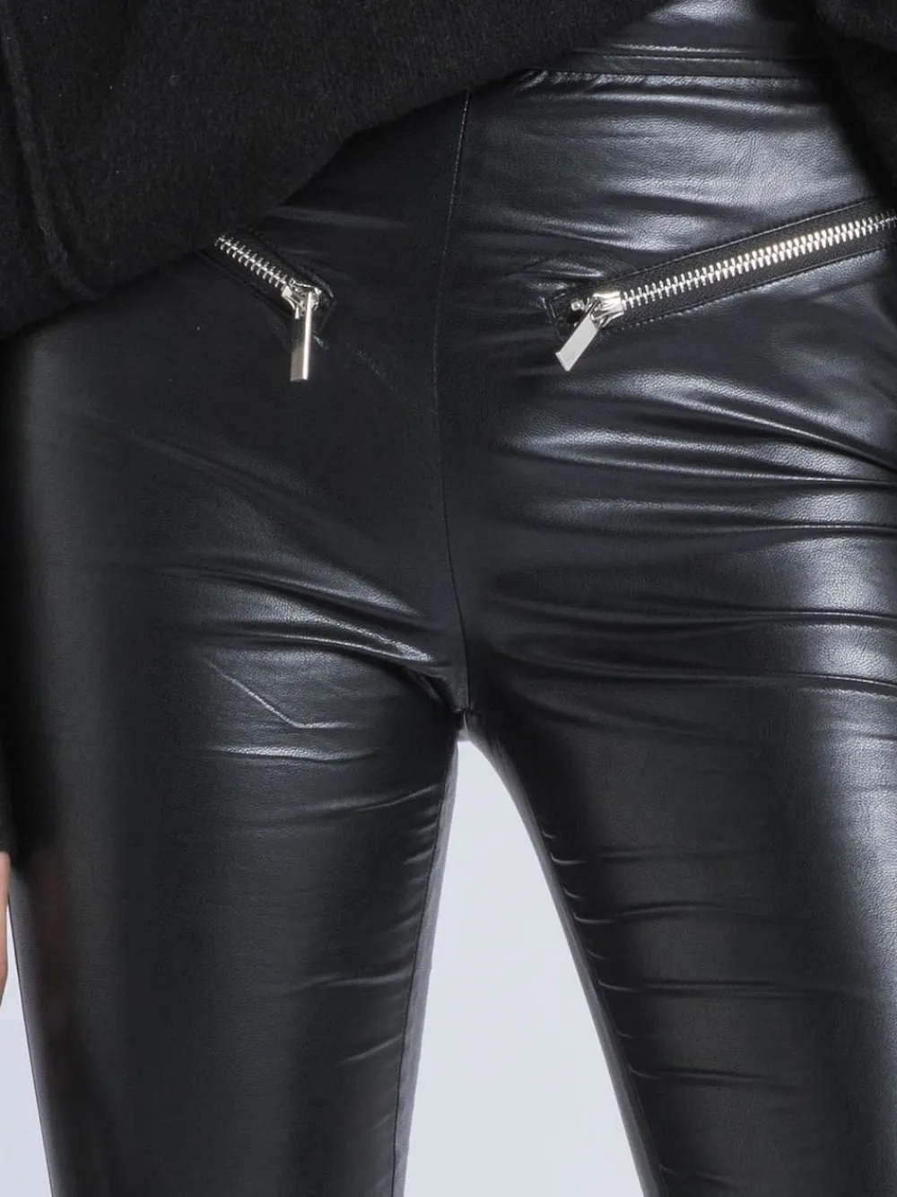 The Ida leggings in black faux leather offer a sleek, fitted silhouette with stylish zip detailing at the front and a convenient side seam zip closure. Their long length makes them versatile, perfect for pairing with a printed top or a cozy knit for an effortlessly chic look. Inside leg length: 74 cm. The model wears a size UK 10. Hand wash only. Main 55% Polyester, 45% Polyurethane. Lining 100% Viscose.