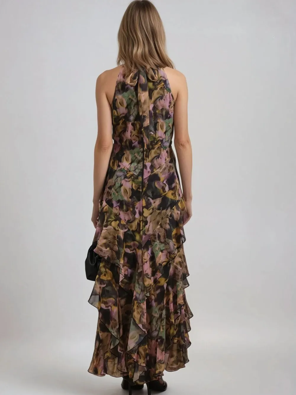 The Taylor maxi dress is a stunning occasion piece featuring a halterneck design with a fitted bodice and a dramatic, long A-line skirt adorned with delicate frills. The dress showcases our summery, abstract Obscure print in soft yellow and pink tones. Its sleeveless style enhances its flowy, ethereal feel, making it perfect for special occasions. Crafted from 55% recycled polyester made from recycled bottles, this sustainable dress combines elegance and eco-conscious fashion, offering a floaty and feminine silhouette. Length from the top: 140 cm. The model wears a size 10. Regular side neck to hem 55″ / 140cm. Machine washable. 100% Polyester.