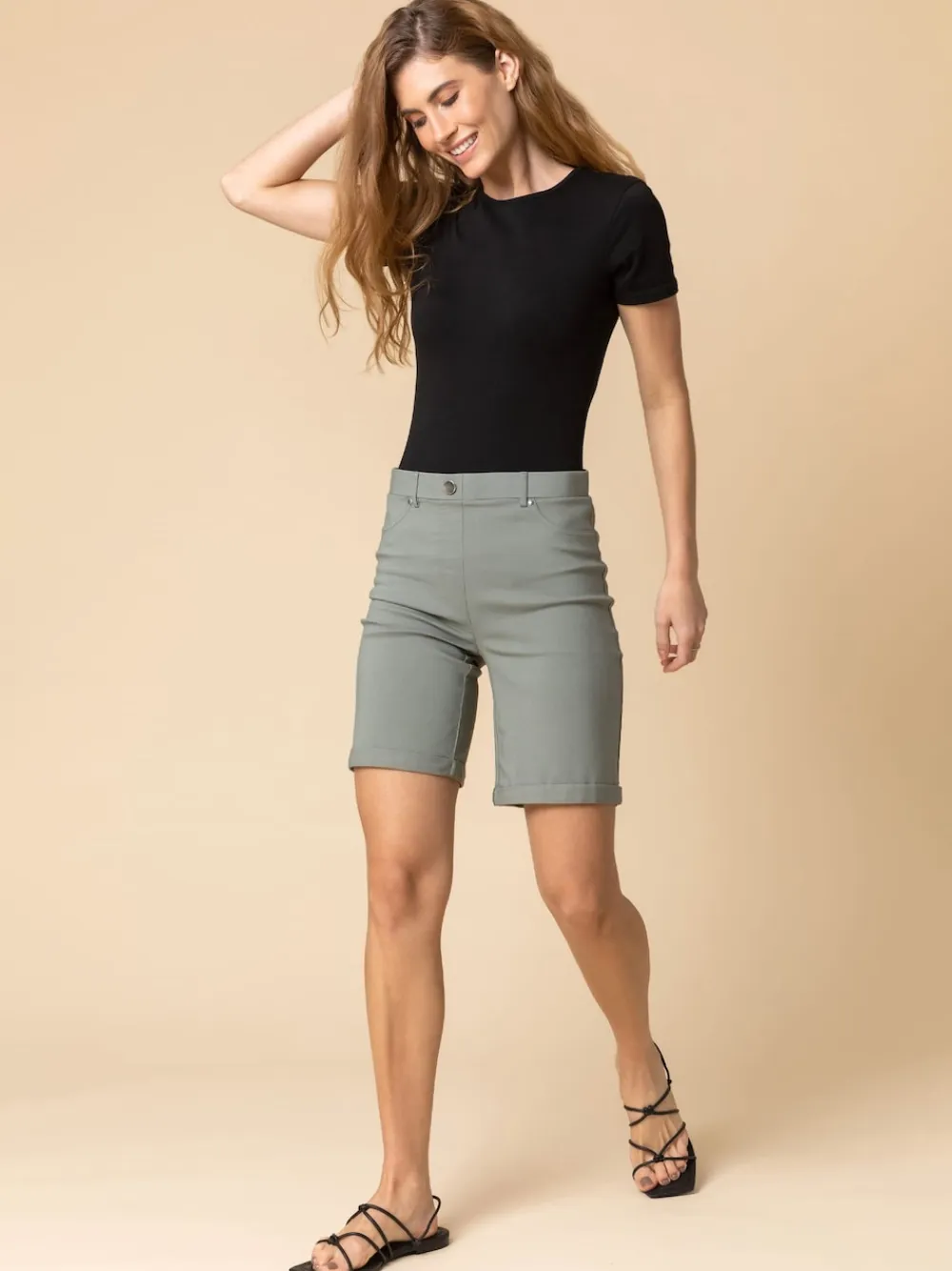Say hello to your newest Summer must-have! These Pear Green turned-up hem shorts are guaranteed to become a suitcase staple. Crafted from our favourite bengaline stretch fabric, these shorts curve to the contours of your body, providing maximum comfort and style. Complete with stitch pocket detail, functional belt loops, and button detail, these mid-length shorts are versatile and right on trend. Pair with printed blouses and sandals or plain bodies and lightweight cardigans for relaxed Summer looks! Machine washable. 76% Viscose, 21% Nylon, 3% Elastane.