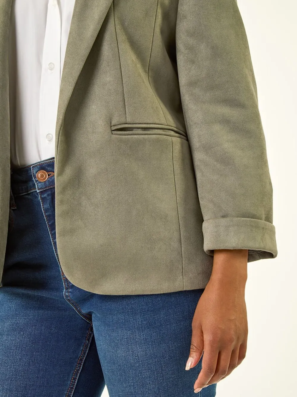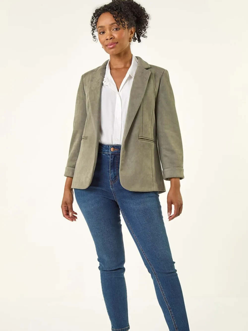 Elevate your Autumn/Winter wardrobe with this chic suedette blazer. Crafted from a soft suedette fabric this blazer features a classic collar and rever, and stylish 3/4 sleeves. Perfect for layering over knitwear and Denim Trousers for a polished and on-trend look this season. Machine washable. 93% Polyester, 7% Elastane.
