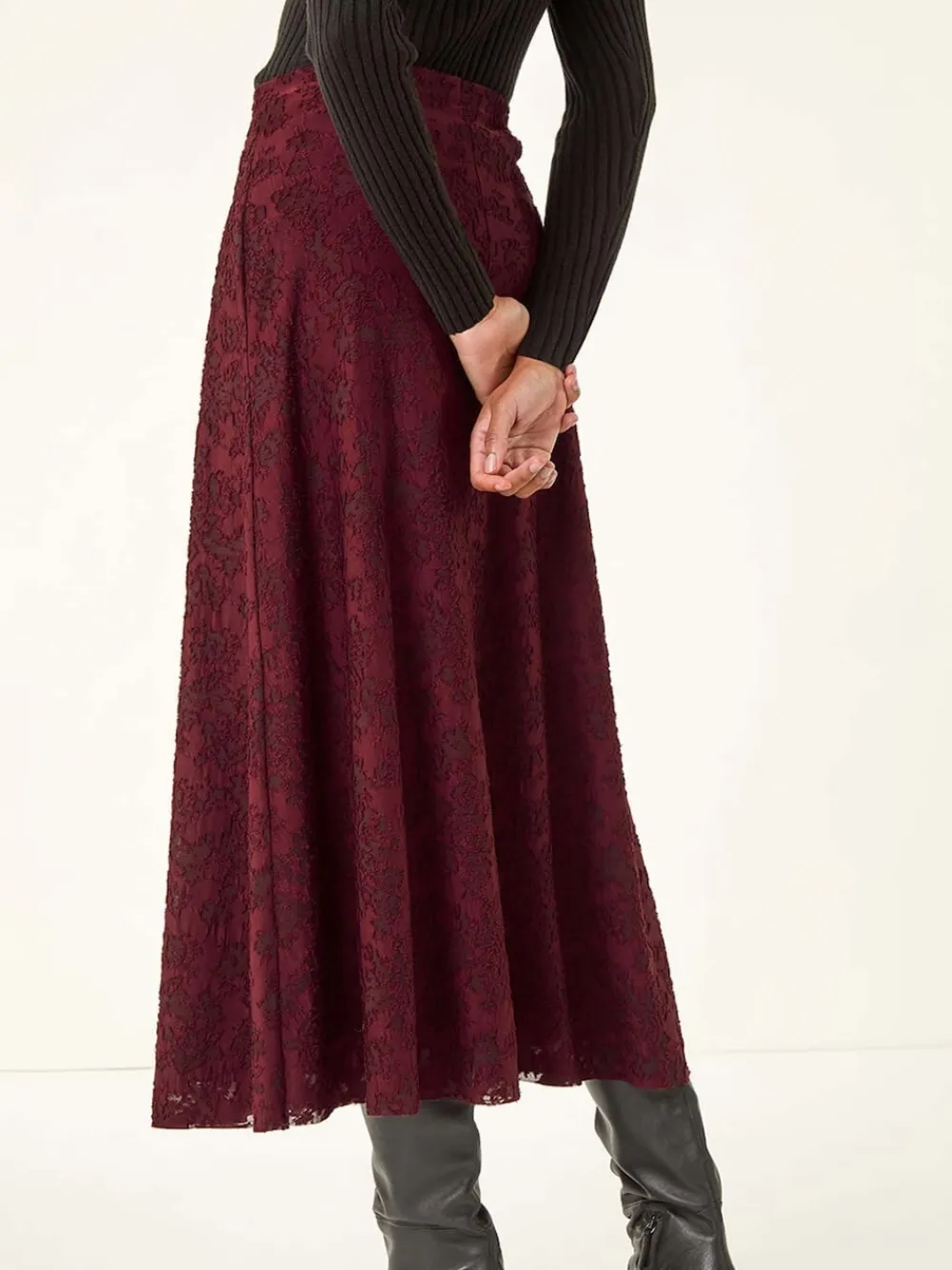 Add a touch of elegance to your Autumn/Winter wardrobe with this stunning floral textured skirt. The a-line silhouette and elasticated waist ensure a comfortable and flattering fit, while the fully lined design adds an extra layer of sophistication. Pair this versatile skirt with your favourite knitwear and boots for a chic and stylish look that transitions effortlessly from day to night. Regular waistband to hem 34.5″ / 88cm. Machine washable. 96% Polyester, 4% Elastane.