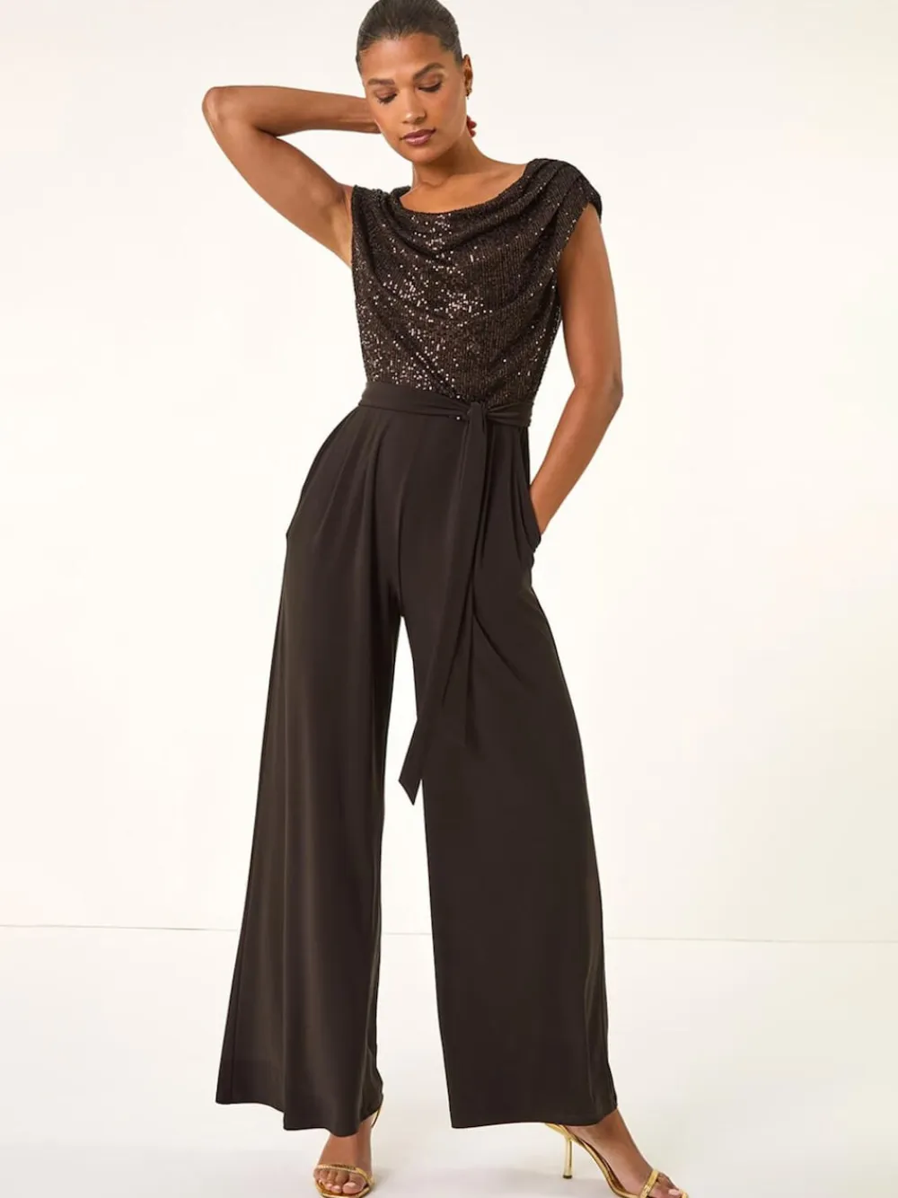 Make a dazzling entrance in this black sequin bodice jumpsuit. Featuring a stylish cowl neck, this full-length jumpsuit is perfect for evening events and special occasions during the Autumn and Winter seasons. The sequin detailing adds a touch of glamour to the classic black colourway. Complete your look with heels and a chic blazer for a sophisticated and glamorous ensemble that will turn heads wherever you go. Regular inside leg length 30″ / 76cm. Machine washable. 95% Polyester, 5% Elastane.