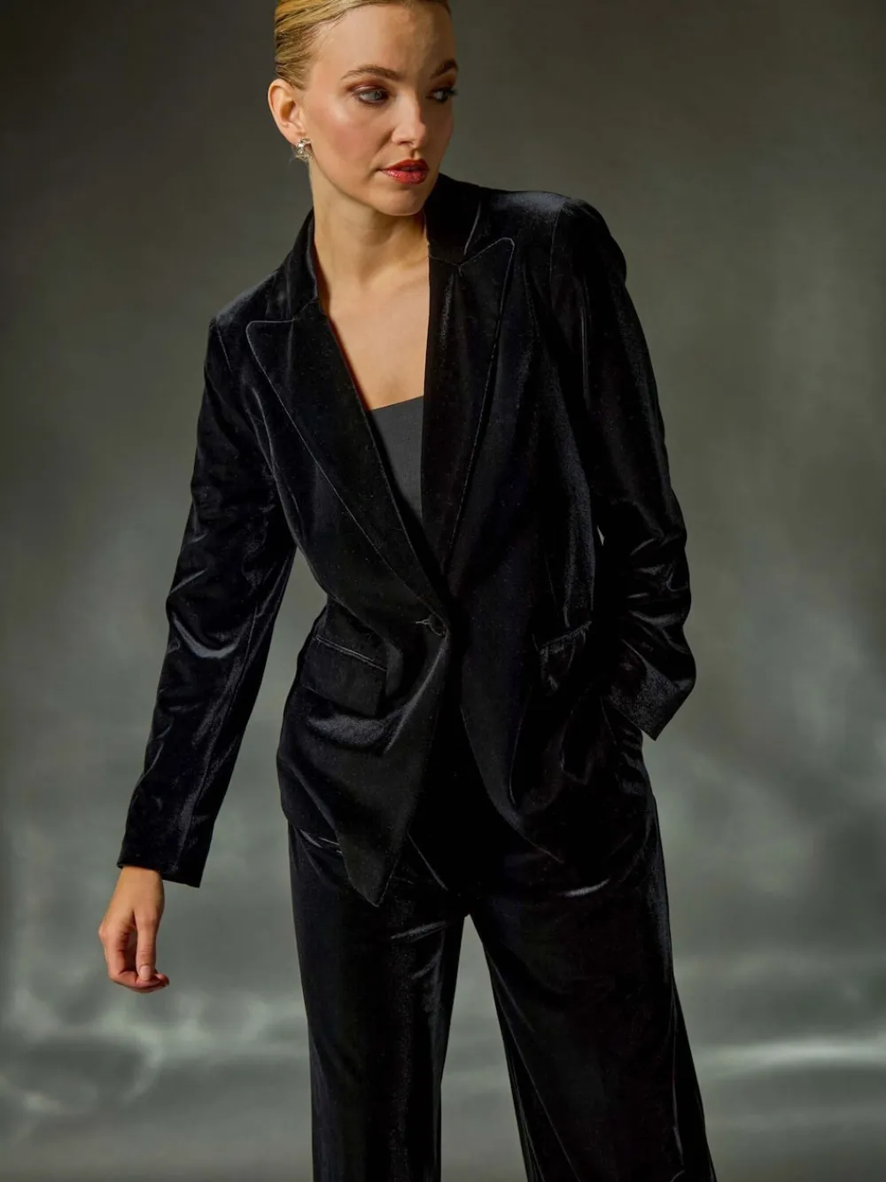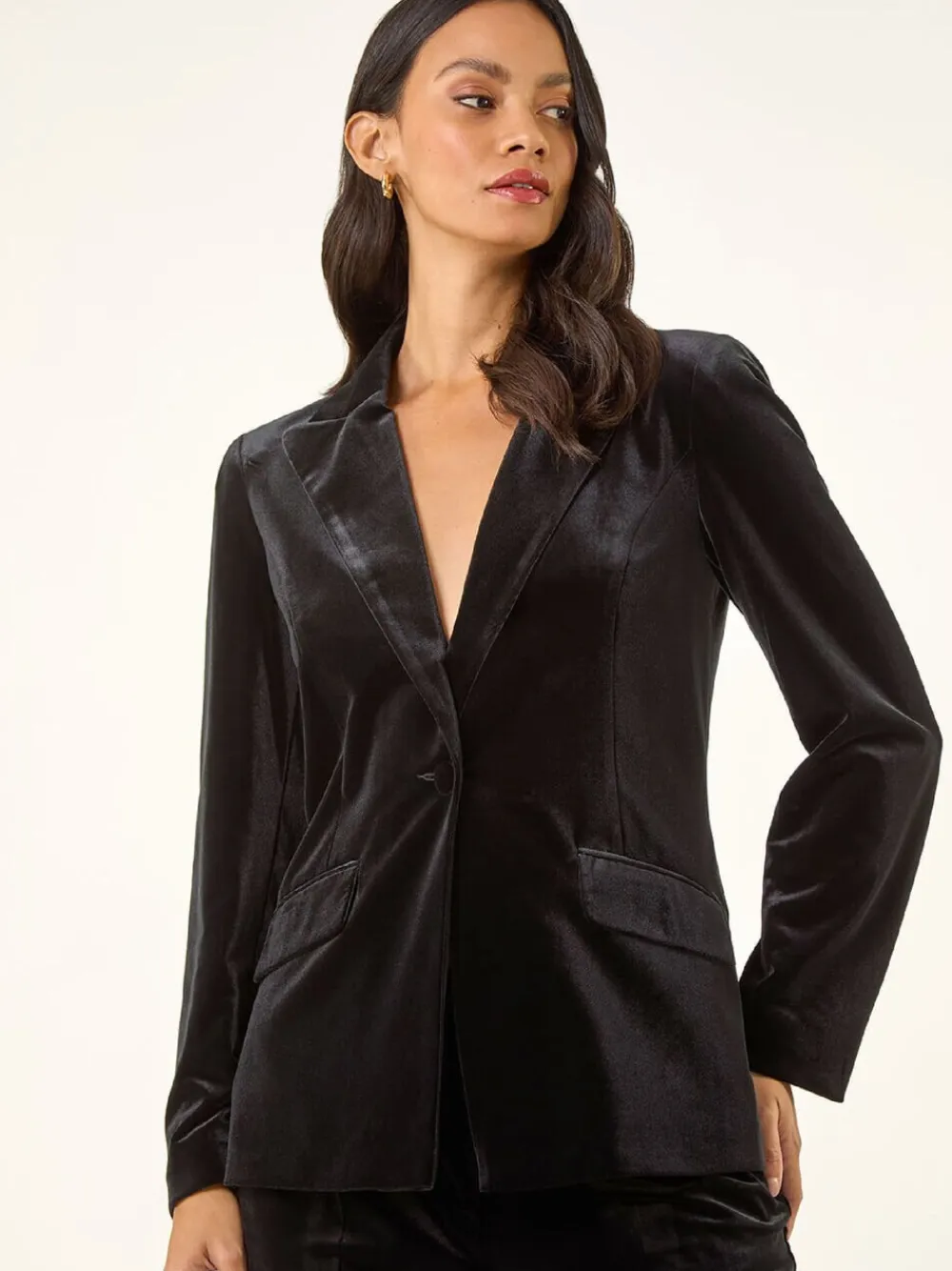 Stay warm and stylish this Autumn Winter in our single-breasted jacket. The jacket features a classic collar and rever style with a button detail for added elegance, and long sleeves to keep you cosy. Crafted from luxurious velvet stretch fabric, this jacket finishes at the hips and comes with front pockets for practicality. For a sophisticated ensemble, pair with trousers and heeled boots for a complete look! Machine washable. 91% Polyester, 9% Elastane.
