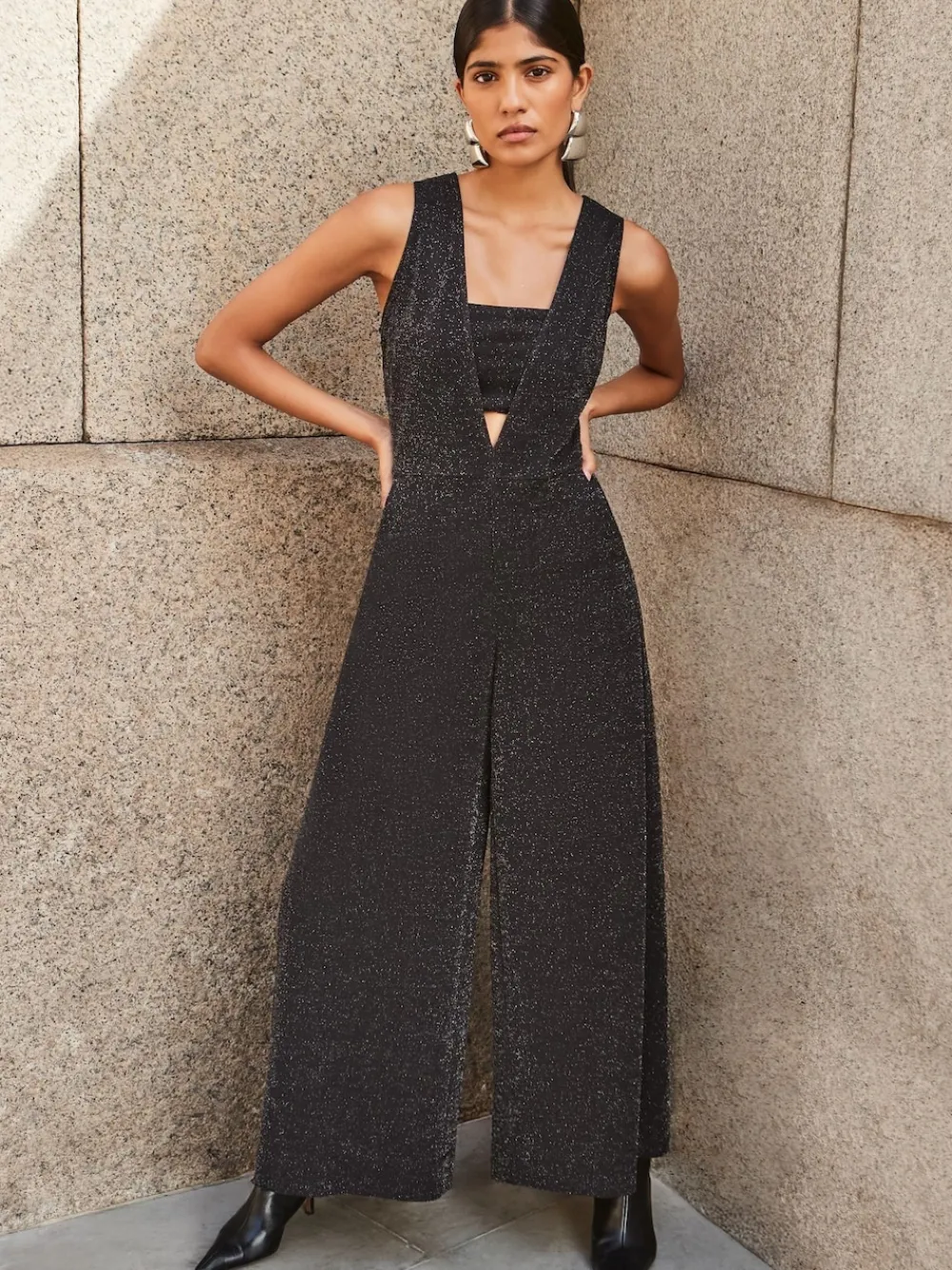 Our Indy jumpsuit delivers on evening glamour. It is cut from shimmering black ponte to a vintage-inspired, wide-leg silhouette, and comes with a coordinating bandeau to complement the plunging V-neckline. Team yours with pointed ankle boots and statement earrings at your next party. Indy is part of our Petite collection, designed for women who are 5’3′ and under. Machine washable. 95% Polyester, 3% Metallised fibre, 2% Elastane.