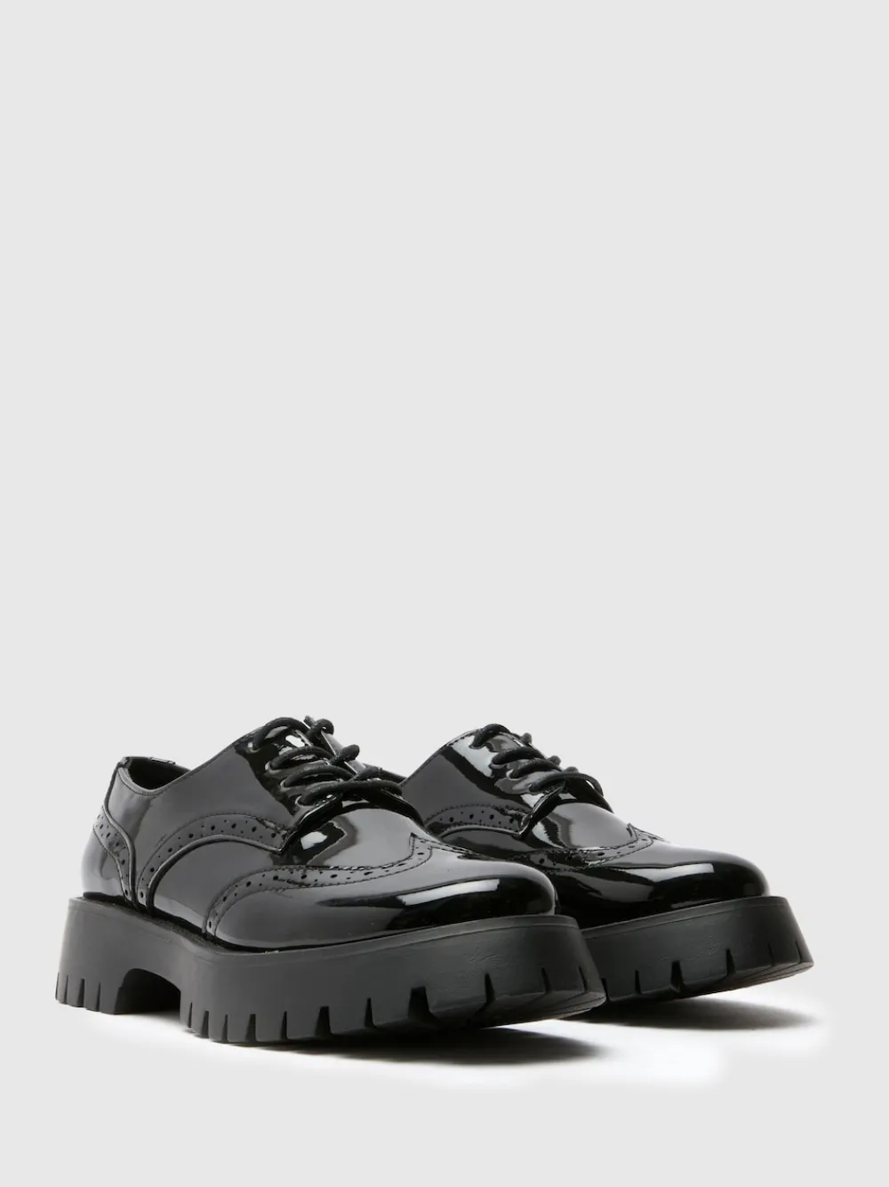 Take on the new school year in style with the Liana Chunky Patent Brogues from Schuh! Arriving in a wide-fit silhouette, these black brogues feature an elevated rubber role while maintaining the timeless brogue silhouette. Heel height 1cm. 99% Polyester, 1% Metallised fibre.