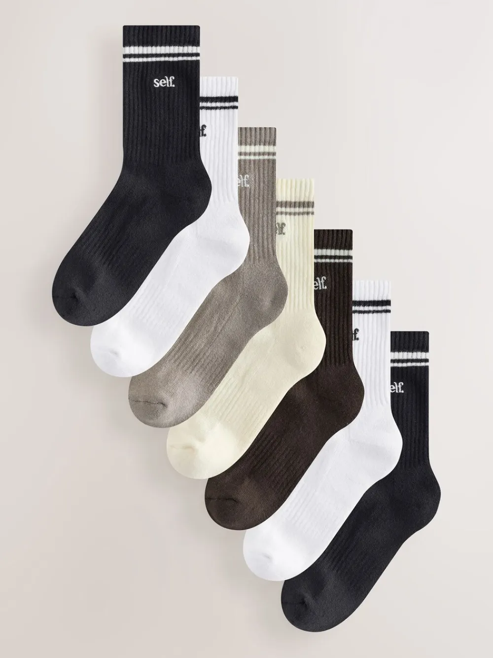 Treat your feet to comfort with these self. socks. This pack includes 7 pairs for every day of the week, with tonal, neutral, white and black socks. Each sock features embroidery detailing, adding a subtle touch of style to your lounge wear. 7 pack Cushion sole Tonal neutral, white and black colours Embroidery detailing 71% Cotton, 25% Nylon, 4% Elastane.