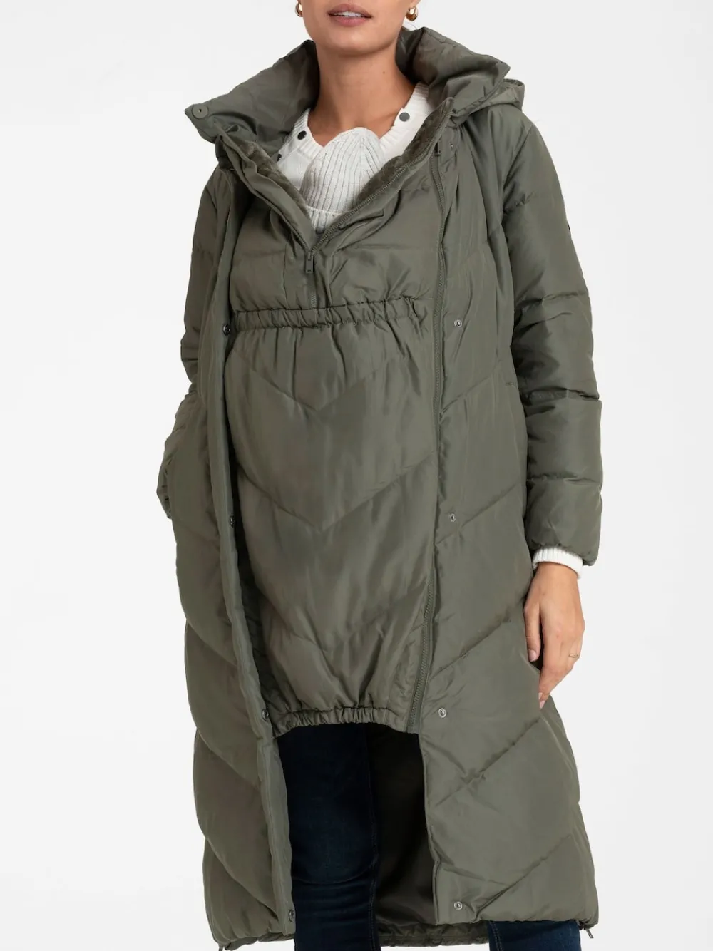 Faux-fur lined Zip-in babywearing panel fits over baby carrier or sling Discreet zip-away panels at the sides Optional zip-on hood Front zip fastening Shower resistant fabric in a quilted chevron design padding 2 side pockets Baby carrier sold separately Wearing length (centre back length, measured from neck to hem, size 10/S): 113cm. Machine washable. Main 100% Polyester. Lining 100% Polyester. Filling 100% Other fibres.