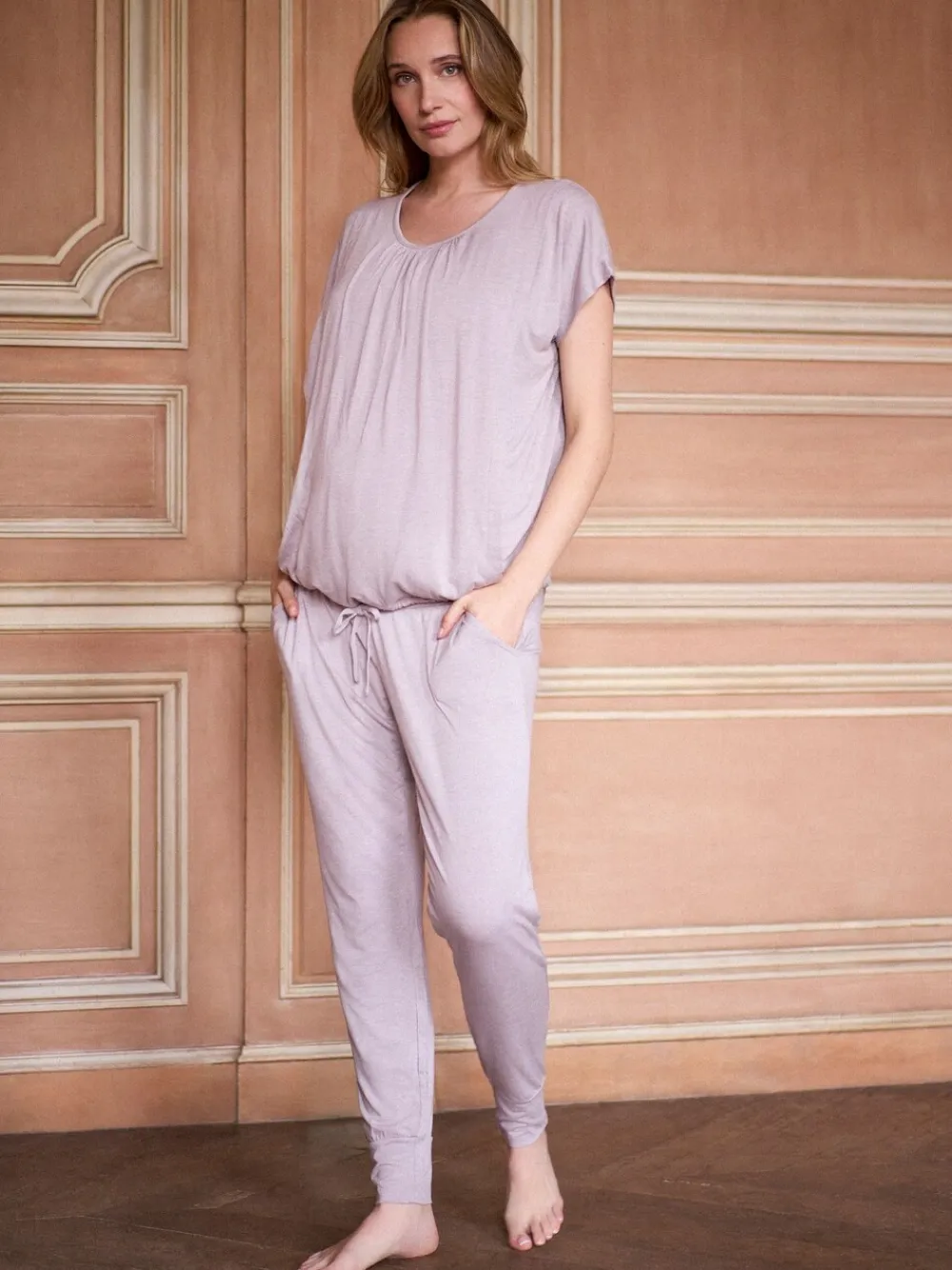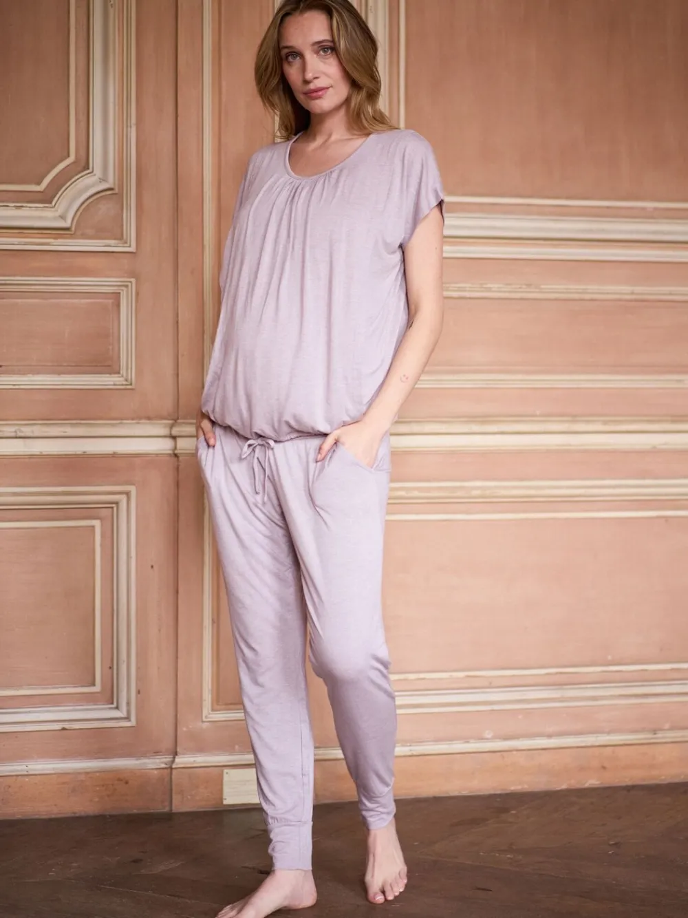 Soft stretch jerseyEasy nursing accessDrawstring ties pull top in under bumpFlexible bottomsBestselling style Machine washable. 96% Viscose, 4% Elastane.