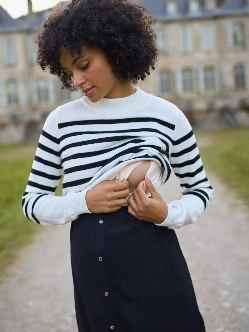 Cosy, comfy & effortlessly chic, our Black Maternity & Nursing Dress comes with its own Breton striped jumper for easy layering. The little black dress features a soft woven skirt, which drapes beautifully over your growing bump. The stylish striped jumper in pure cotton is fully detachable, so it can be washed & worn separately. After baby is born, it lifts up to reveal easy nursing access, so you can keep wearing it long after your due date. Team with tights and boots for effortless style through every stage. Buy your pre-pregnancy size. With over 20 years of maternity expertise, Seraphine styles are designed to grow with you, adapting with you through pregnancy and motherhood. Machine washable. Knit 100% Viscose. Jersey 96% Viscose, 4% Elastane.