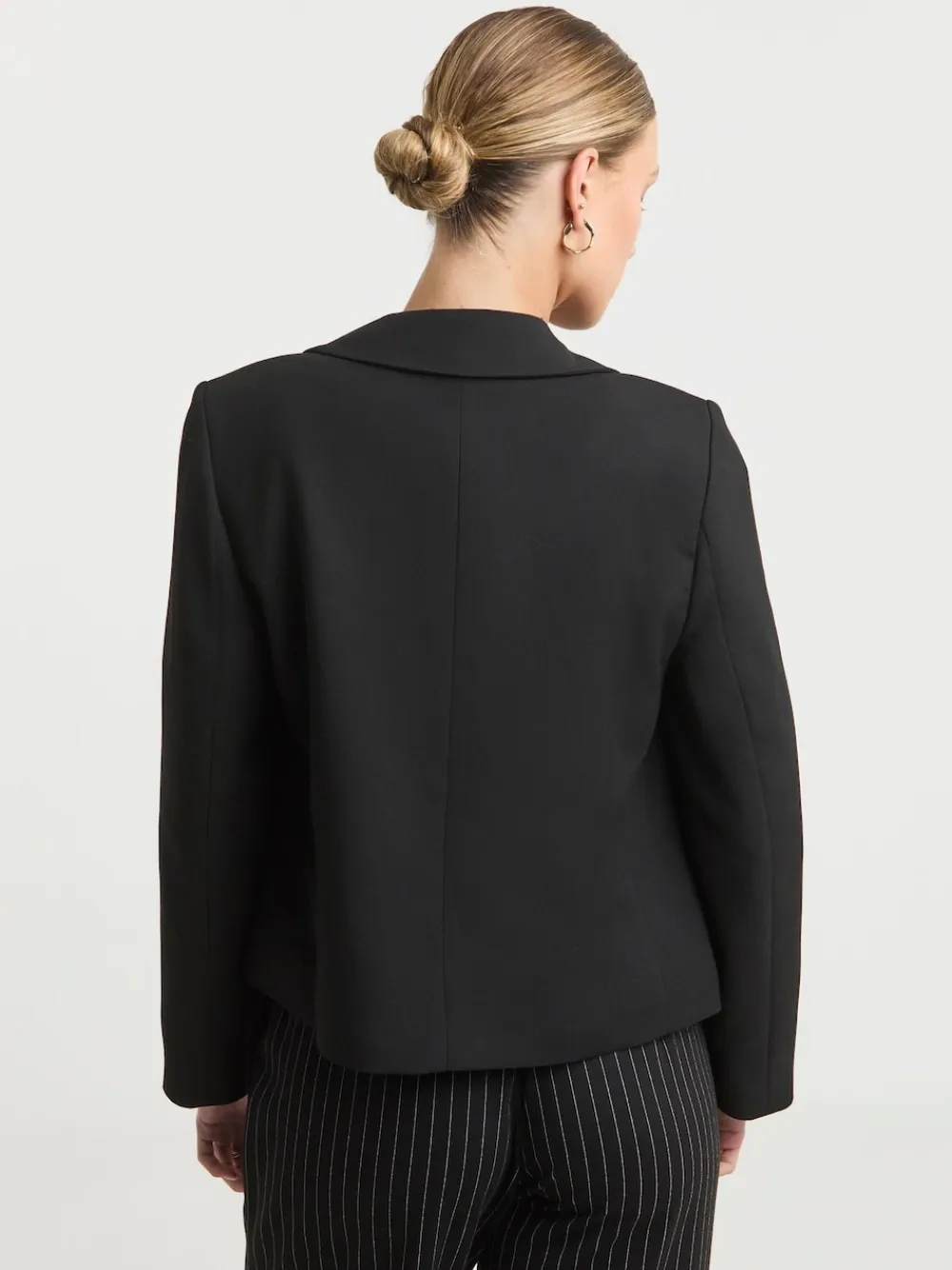 The perfect addition to your wardrobe this season, shop this black blazer featuring an edge to edge shape, tailored fit and cropped shape. Simply pair with jeans and strappy heels for the perfect bottomless brunch outfit. Machine washable. 71% Polyester, 23% Viscose, 6% Elastane.