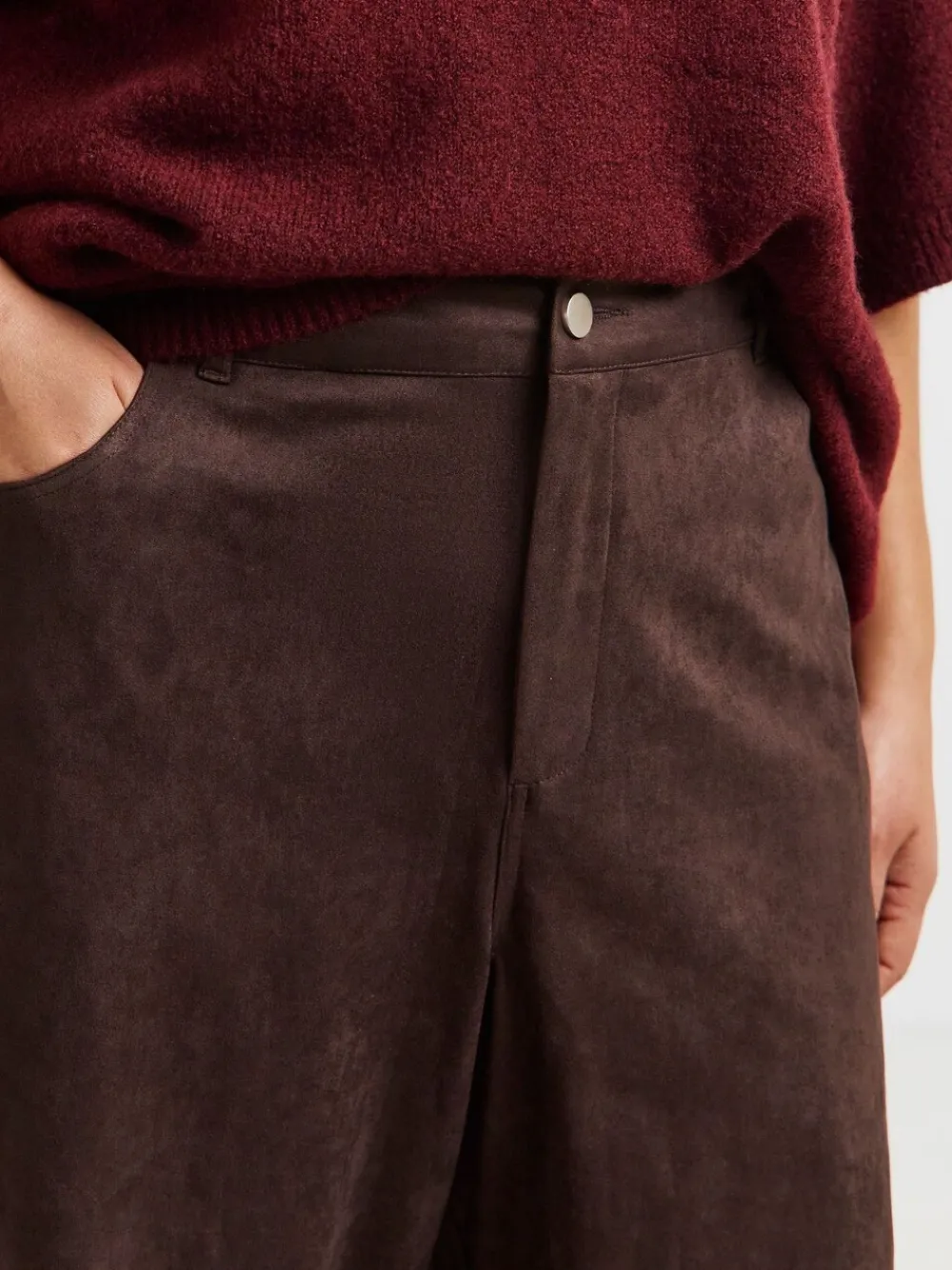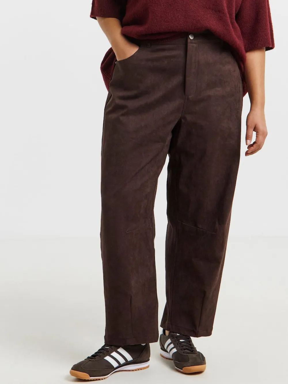 Elevate your daytime wardrobe this season in our new Suedette Barrel Leg Trousers! They feature the latest barrel leg shape, an elasticated waistband for extra comfort, front button and zip fastening, belt loops, front and back pockets, and a beautiful suedette fabric in a rich chocolate colour. Pair with a tee and trainer for the ultimate look. Machine washable. 90% Polyester, 10% Elastane.