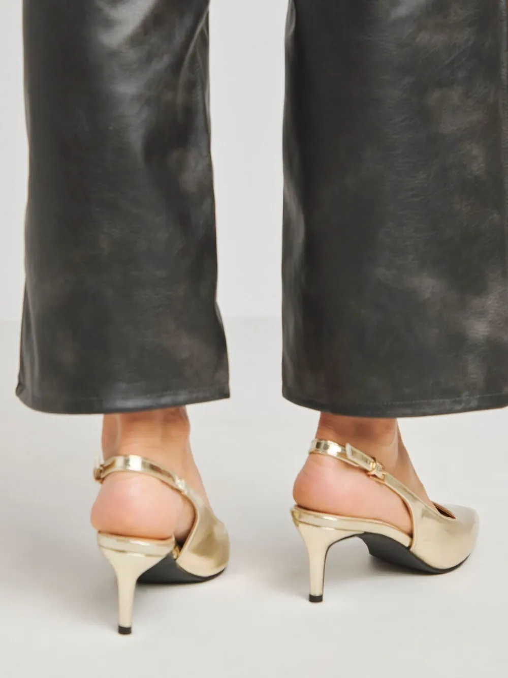 Elevate your shoe collection with these metallic slingbacks, a new take on the classic style. Pointy toe, adjustable slingback with pin buckle fastening, padded sock & set back kitten heel for ultimate comfort. Heel height 6.5cm. Upper – 100% PU. Lining – 100% PU. Sole – 100% Other fibres.