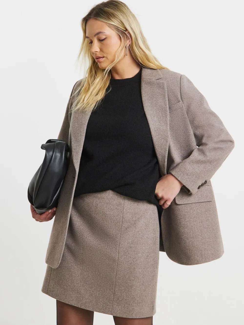 A great addition to your wardrobe this season. Shop this stylish skirt featuring: Mushroom colour, Wool-look, Part of a co-ord. Can be styled with the matching blazer for work or with a T-Shirt or jumper for a more casual look! Regular waistband to hem 18″ / 46cm. Machine washable. 93% Polyester, 7% Viscose.