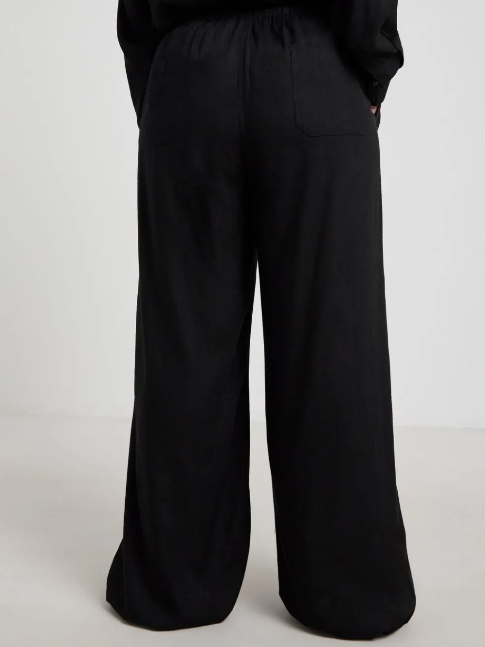 Shop our Linen Wide Leg Black Trousers, a must-have for the season. Fabricated in an easy linen material Perfect for those warmer days Style with a coordinating linen shirt, or throw on a white T-Shirt for an effortless look Regular inside leg length 29″ / 74cm. Machine washable. 80% Viscose, 20% Linen.