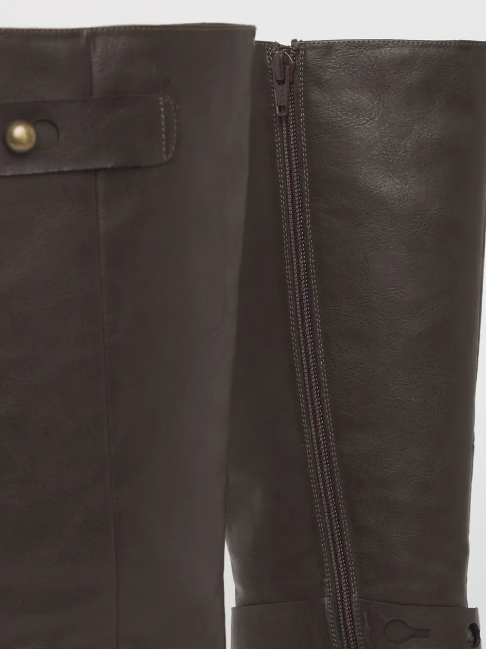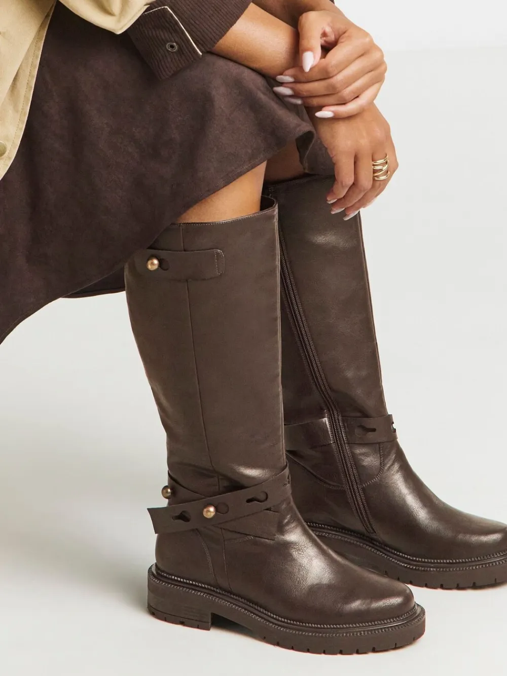 Introducing the perfect winter staple boots. Adjustable strap detailing. Inside leg zip for ease. Smart round toe outsole. Cushioned sock for lasting comfort. Leather.