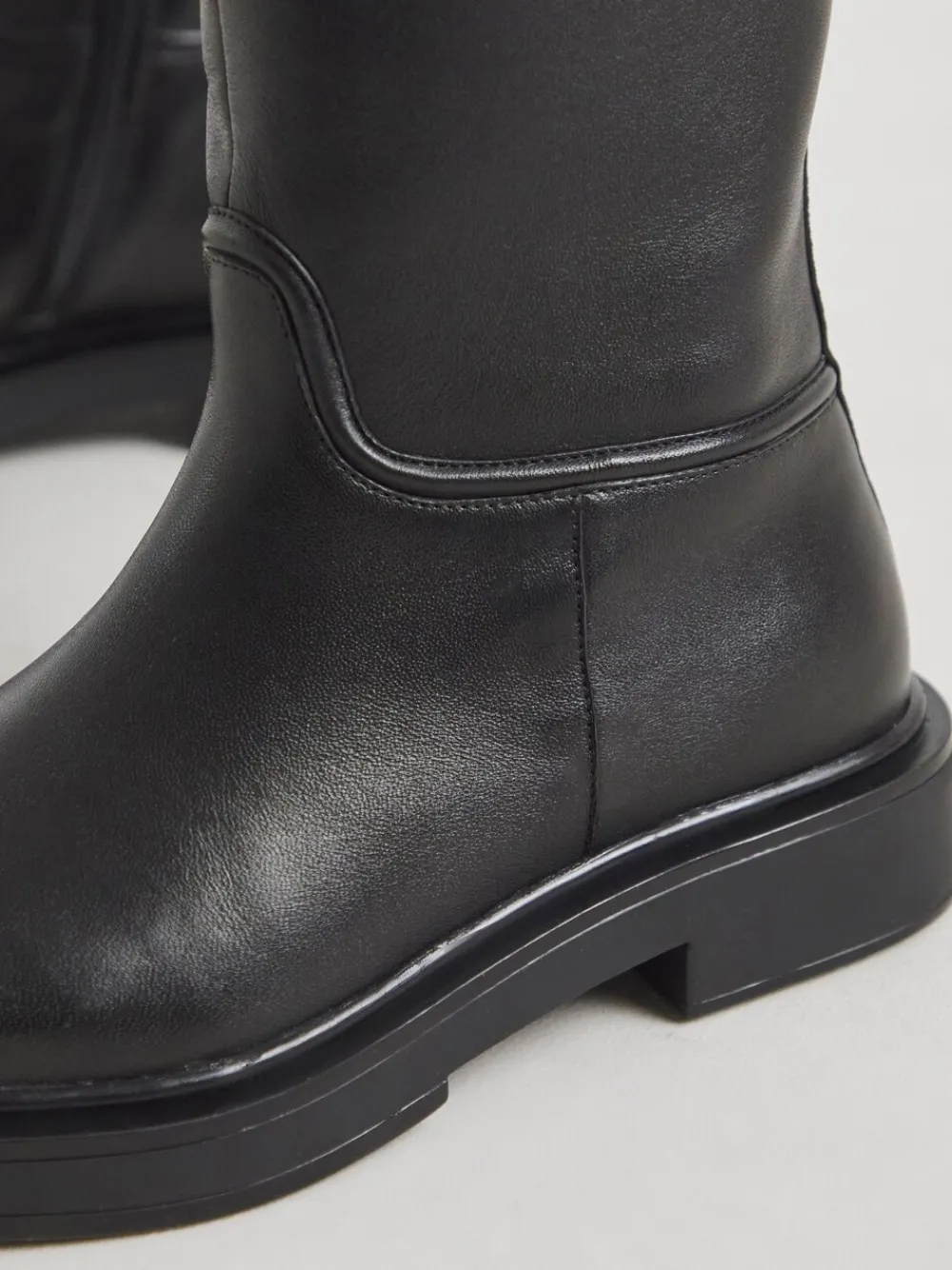 Our best-selling riding boots just got better! Genuine leather upper. Pull tab and inside leg zip for ease. Piping detailing, Rounded toe and cushioned sock for comfort. Leather.